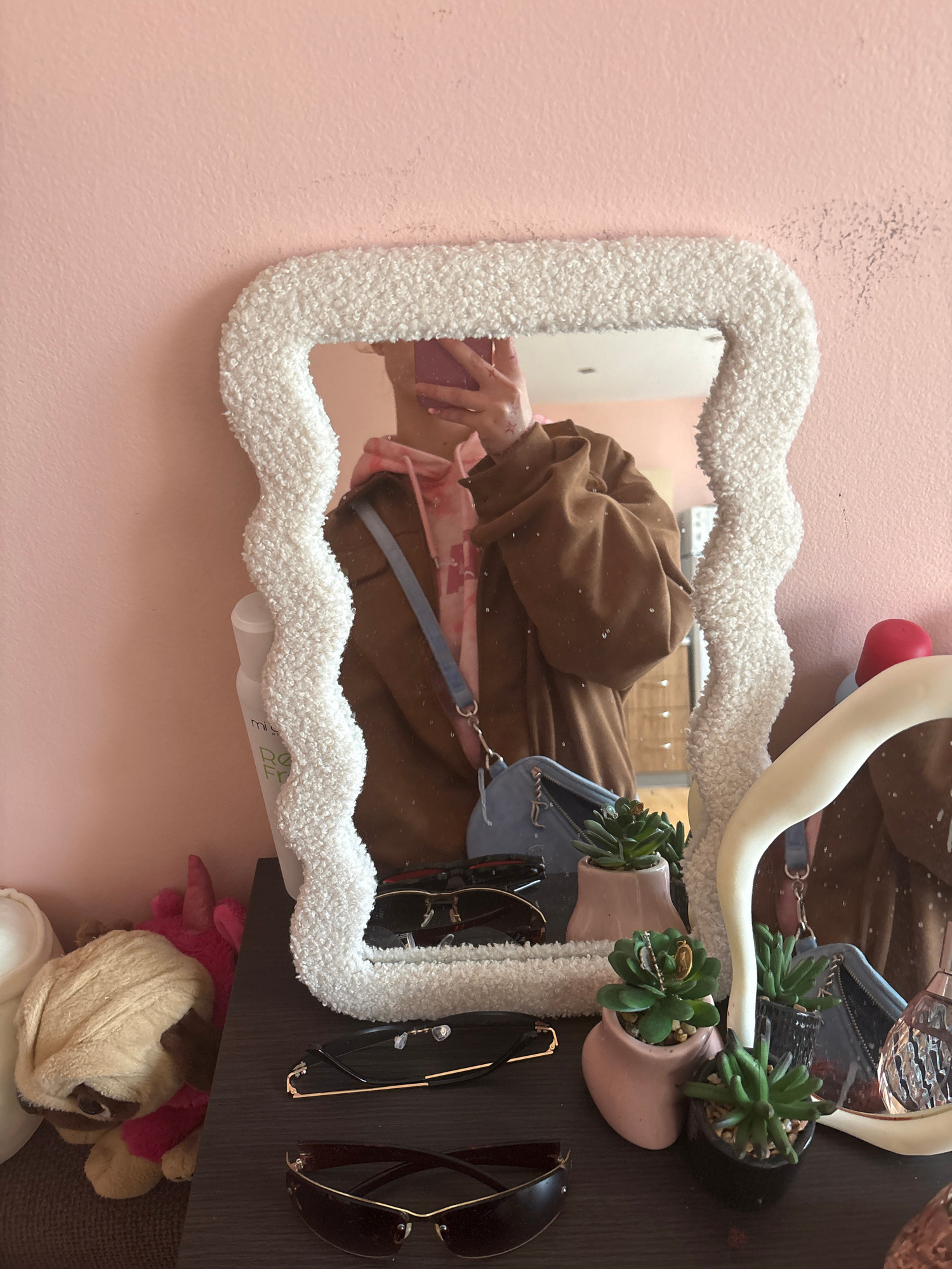 The image shows a mirror with a white, textured frame mounted on a light pink wall. The mirror reflects a person wearing a brown jacket and holding a pink cell phone. A light blue purse with a strap i…read more