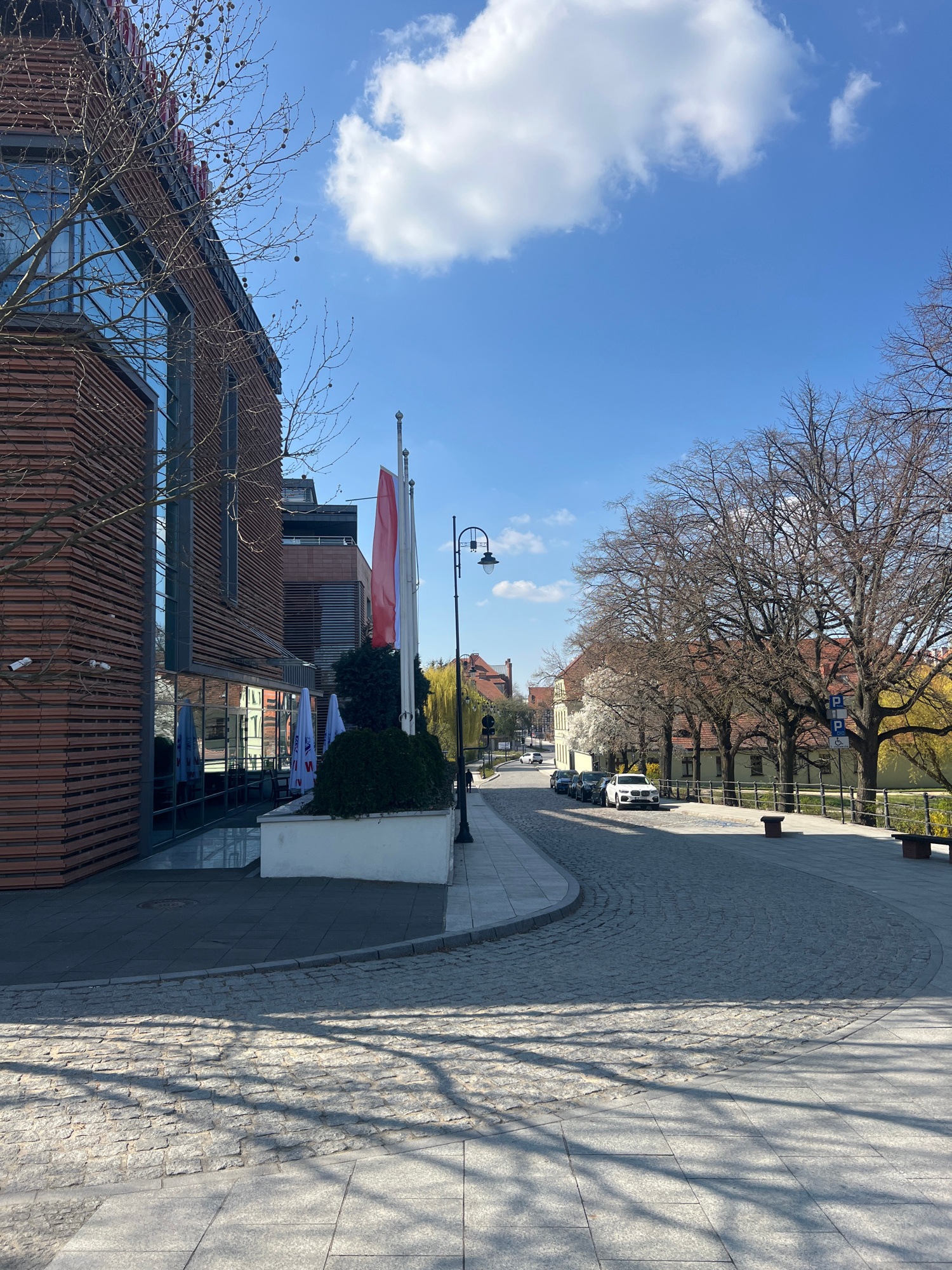 The image depicts a view in Bydgoszcz, Poland, on a sunny day. The sky is blue with scattered clouds. The foreground features a modern building with a brown facade and large glass windows. A bare tree…read more