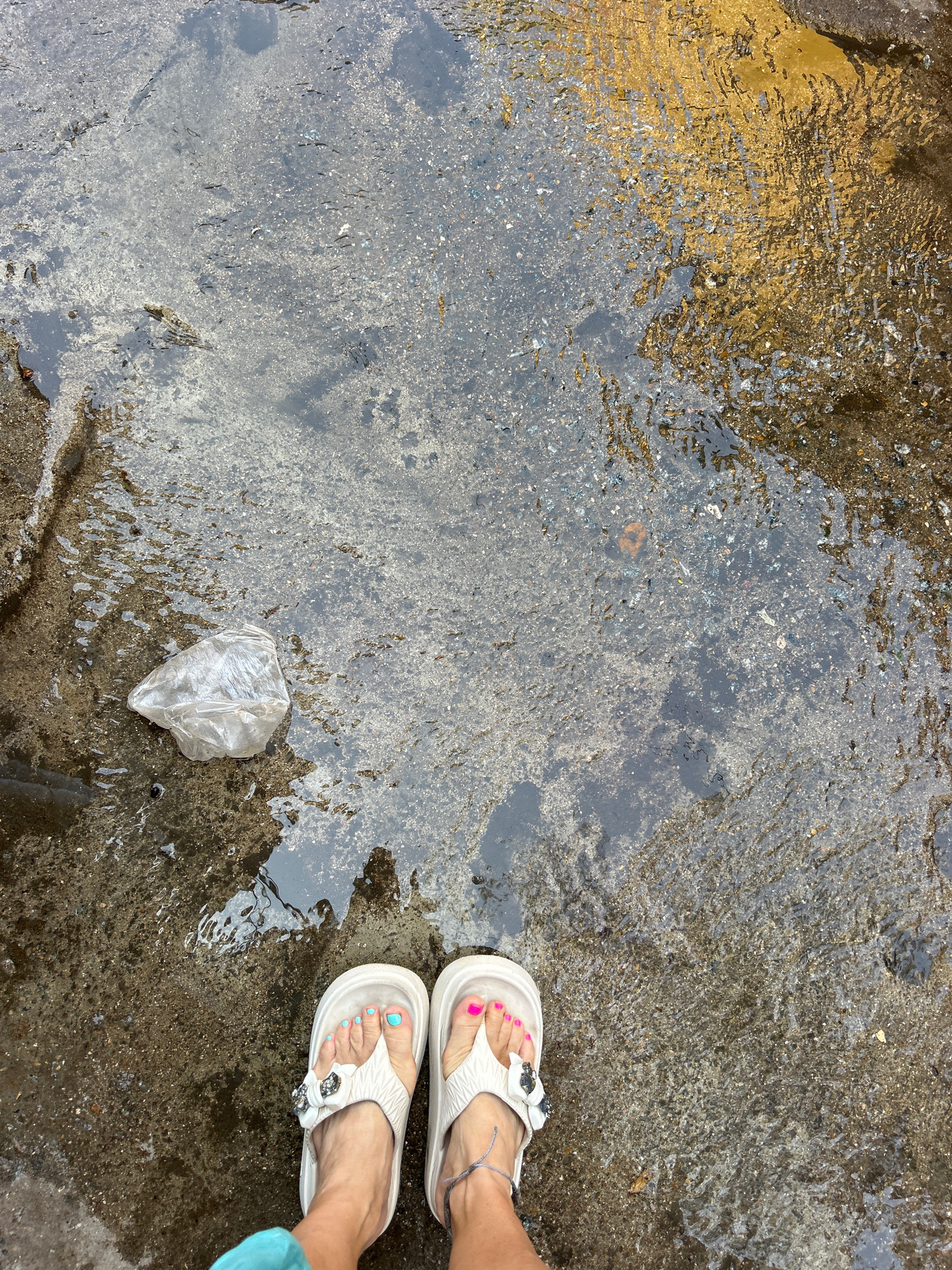 A high-angle, full shot depicts a waterlogged concrete surface in Puttaparthi, India. The left third of the frame shows a yellow-tinged section. The remaining area is covered in a reflective layer of…read more