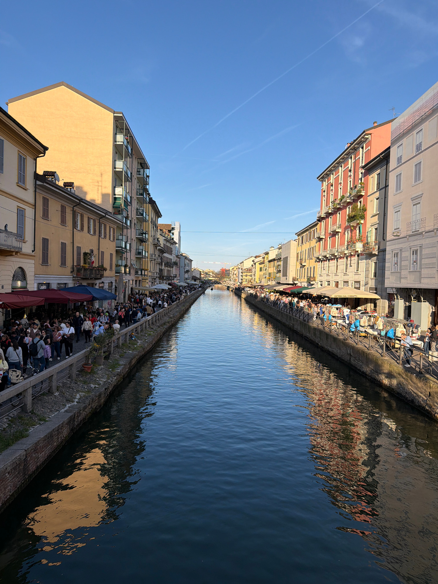 The image depicts the Naviglio Grande canal in Milan, Italy, lined with buildings and a bustling crowd. The buildings are varied in style, featuring balconies and windows. A large crowd of people cong…read more