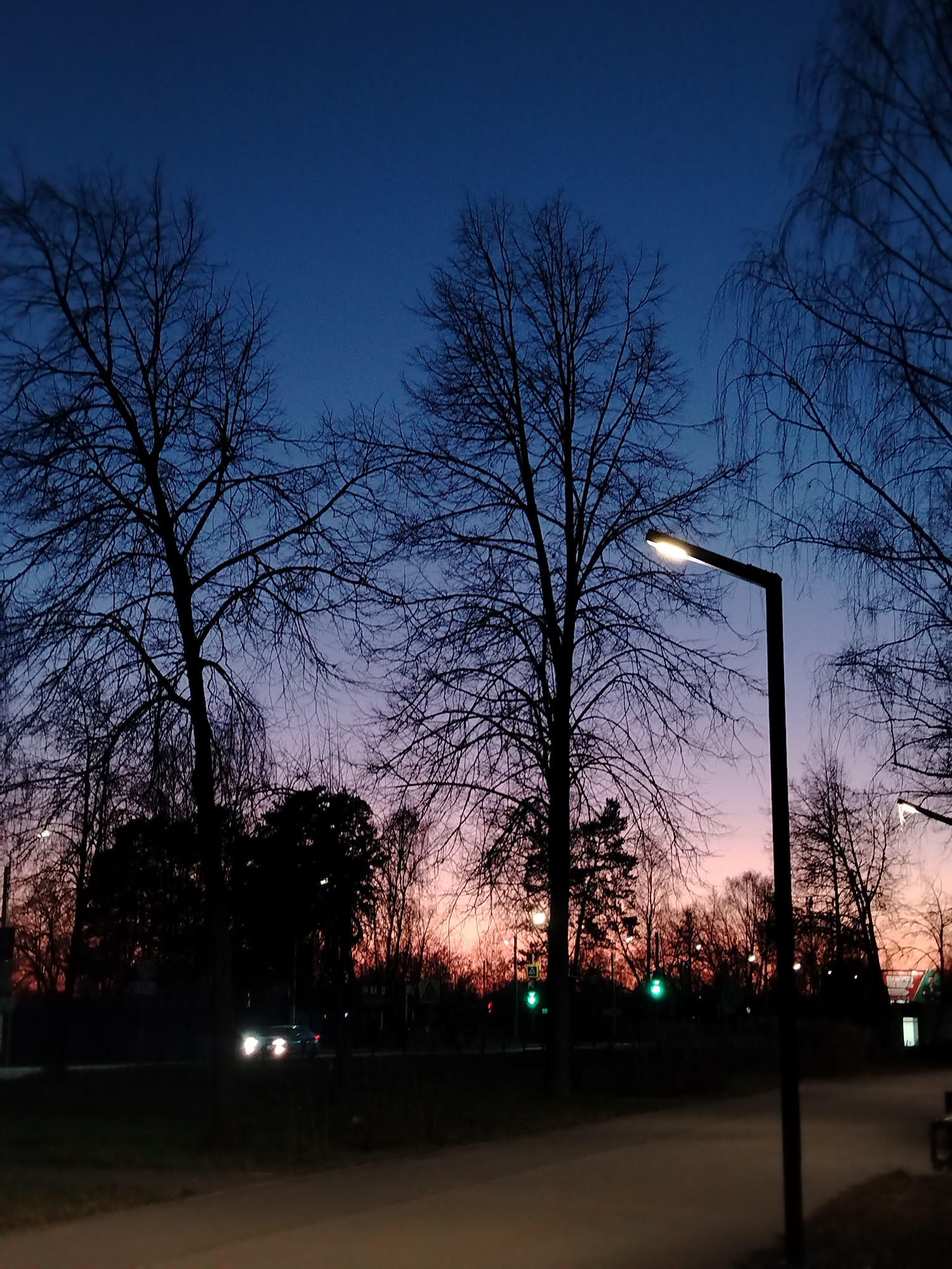 The image captures a dusky urban scene in Chaikovsky, Russia, likely during twilight. Silhouetted bare trees dominate the foreground, their branches stark against a gradient sky that transitions from…read more