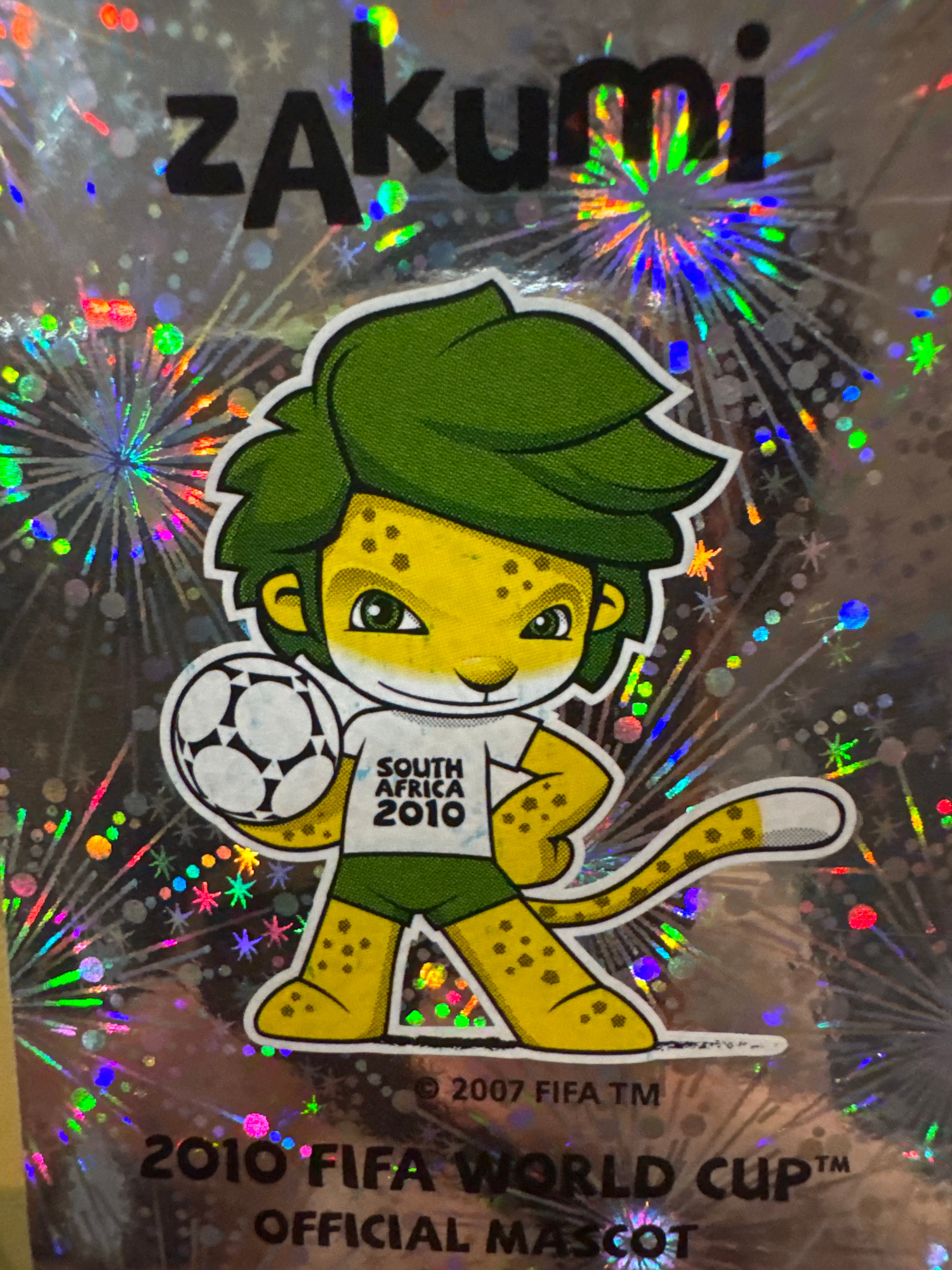 The image shows a sticker featuring Zakumi, the official mascot of the 2010 FIFA World Cup, held in South Africa. Zakumi is depicted as a yellow leopard with green hair, wearing a white t-shirt that r…read more
