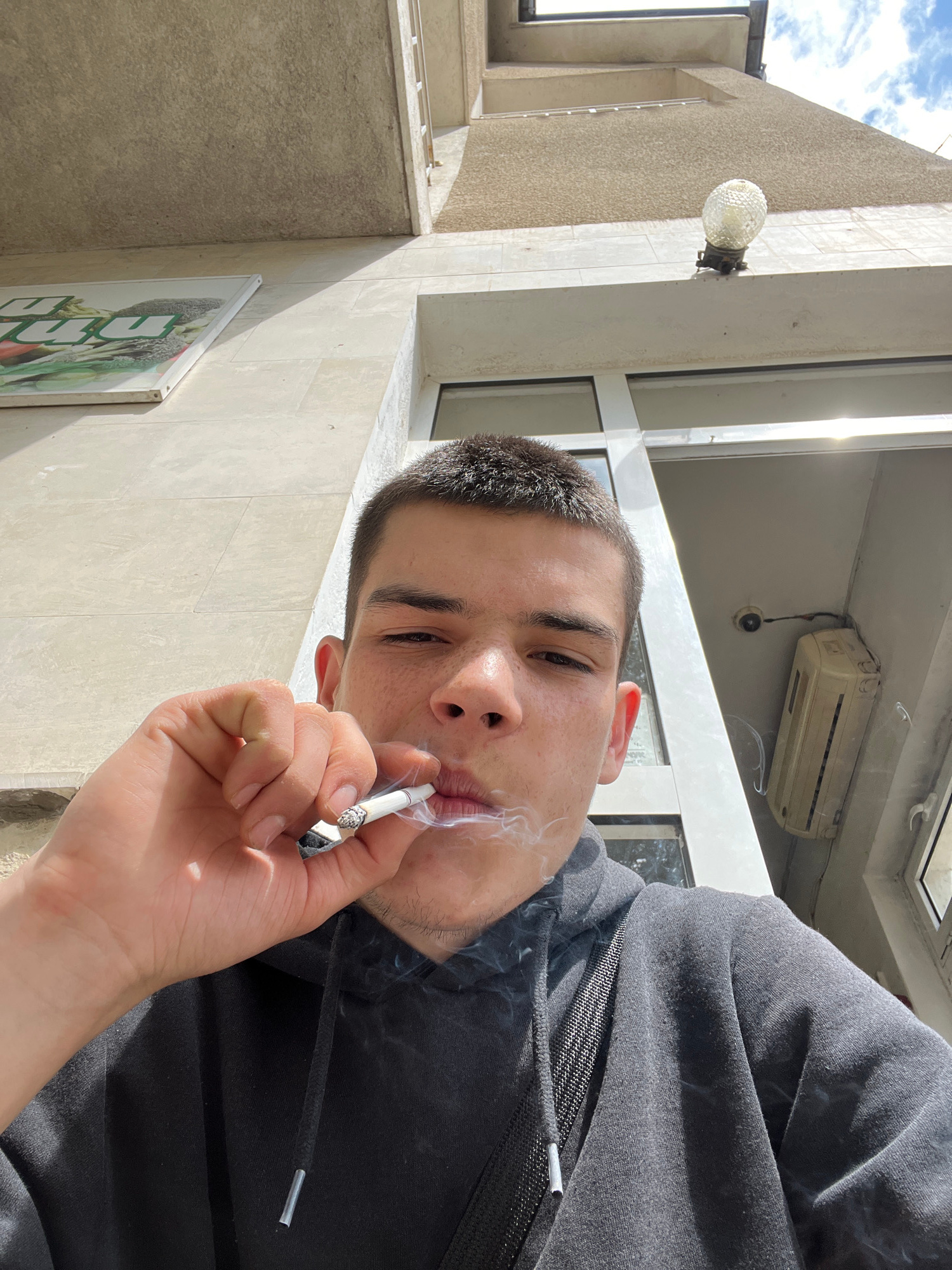 A young man is captured in a close-up, low-angle shot, positioned on what appears to be an outdoor balcony or terrace in Karlovo, Bulgaria. He is wearing a dark grey or black hooded sweatshirt and loo…read more