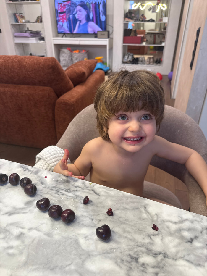 Location: Indoor domestic setting, in the city of Unknown, Unknown. A light-skinned toddler, with brown, bowl-cut hair and blue eyes, is seated shirtless in a light beige upholstered chair at a white…read more