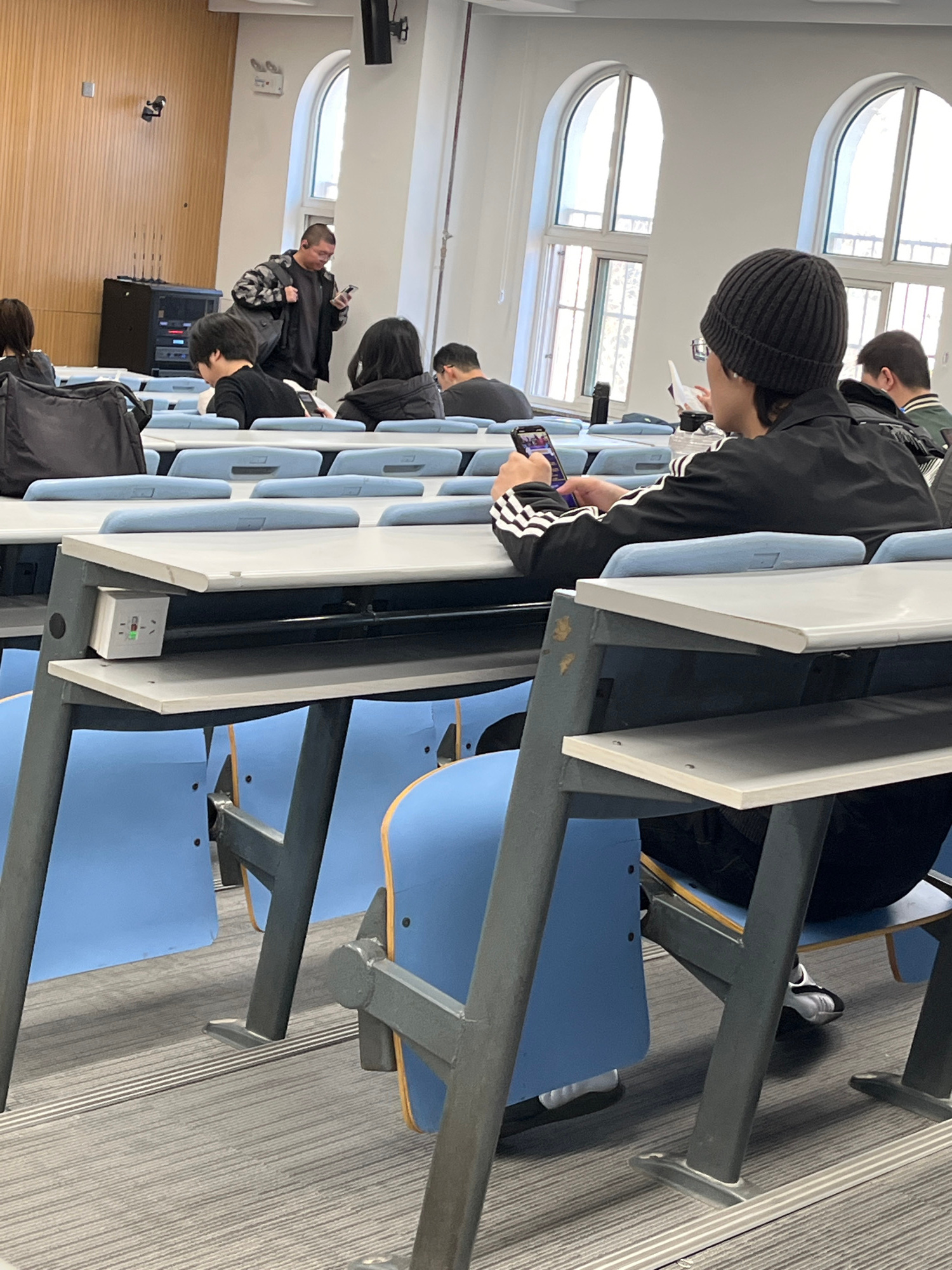 The image depicts a classroom setting. A row of students is seated at desks with light blue seats and white writing surfaces. At least seven individuals are visible, most focused on electronic devices…read more