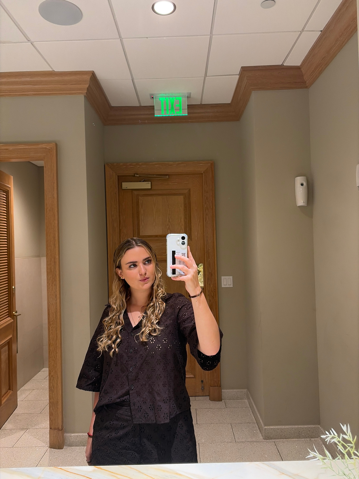 A woman is taking a selfie in a restroom. The restroom has tile walls, a tile ceiling, and wooden trim around the walls and doorways. An exit sign is on the ceiling. The woman is wearing a black top a…read more