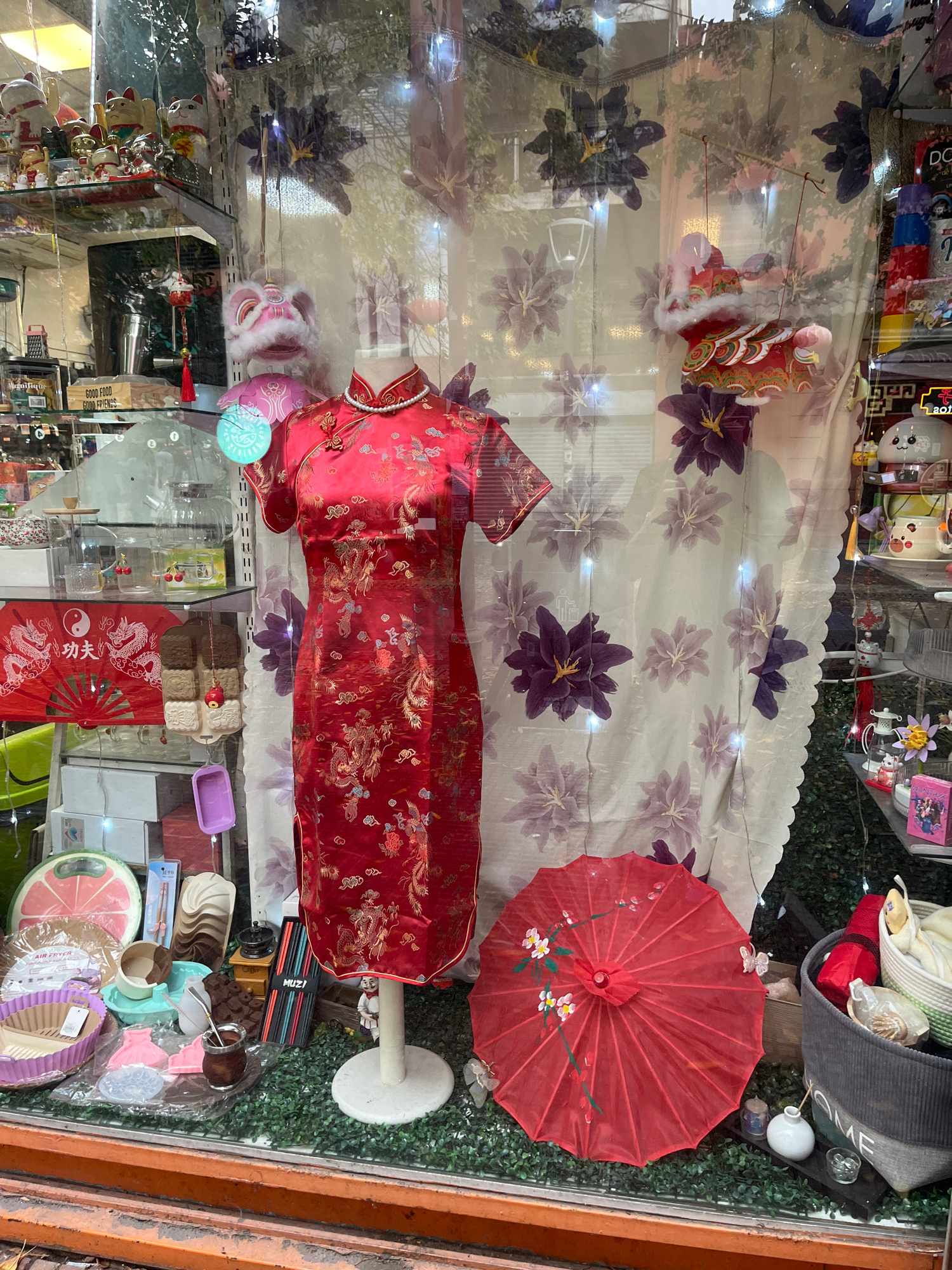 This image captures a vibrant display window of a store in Buenos Aires, Argentina, seen through a glass pane with noticeable reflections of the outside environment, including greenery. The display is…read more