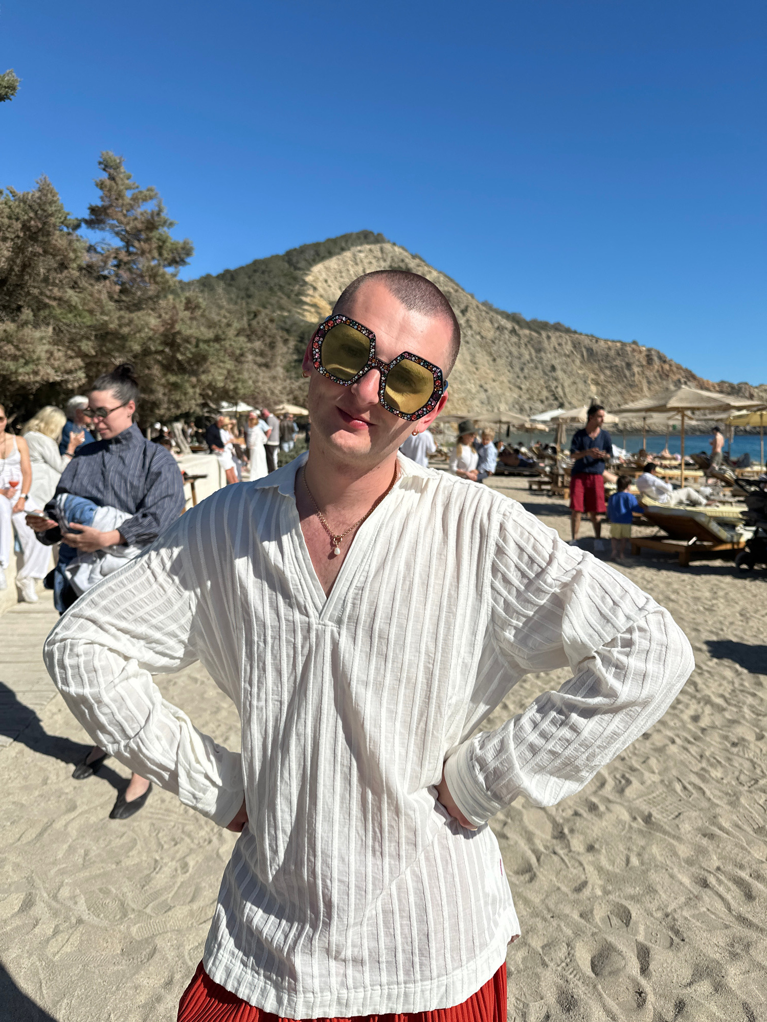 A man with sunglasses and a white striped shirt stands on a sandy beach in Sant Josep de sa Talaia, Spain. He is facing the viewer and has his hands on his waist. Other people are lounging on beach ch…read more