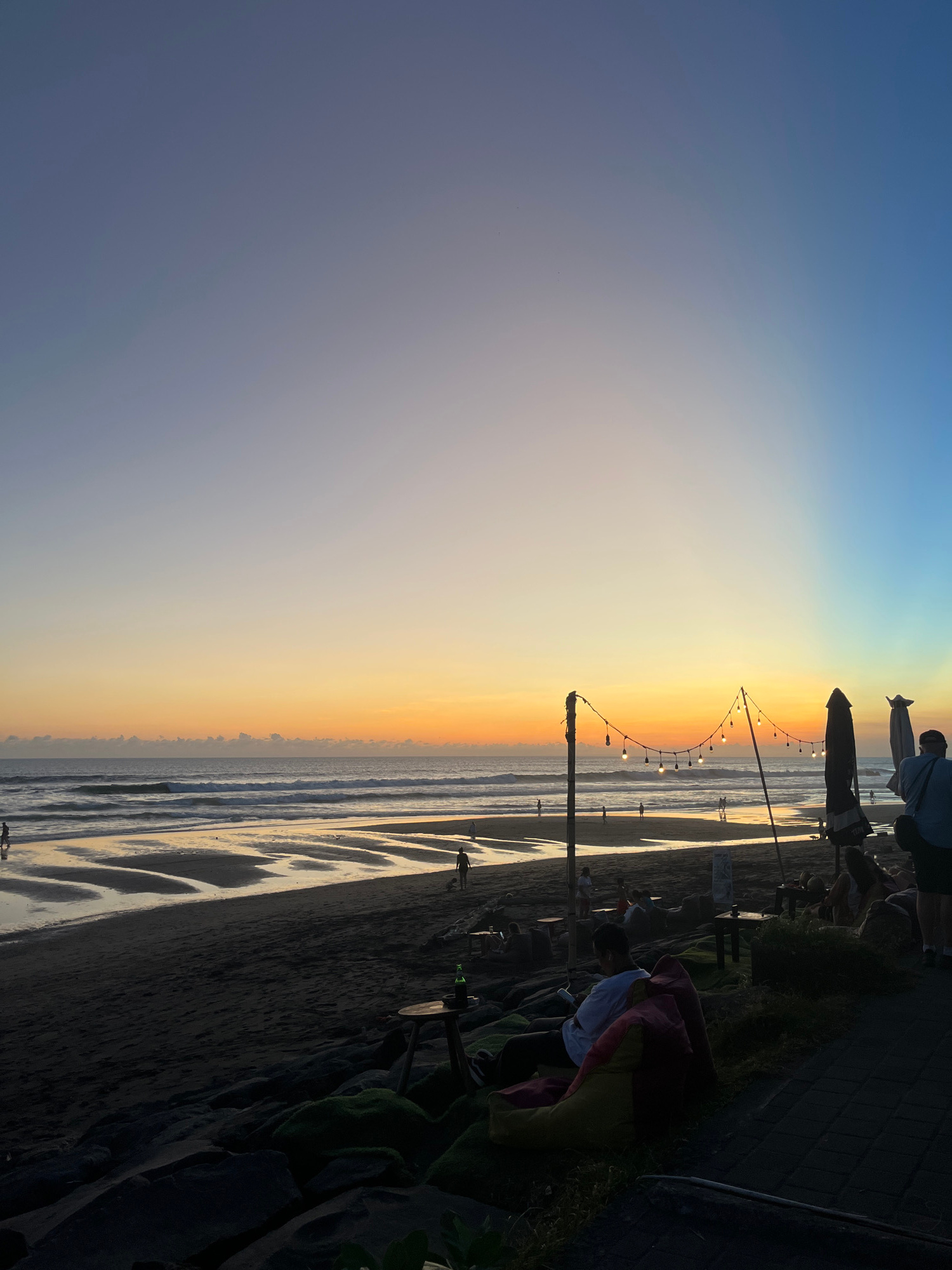 The image depicts a serene sunset scene at a beach in Mengwi, Indonesia, with the frame oriented vertically, giving the impression of the sky being on the left and the ground on the right. When viewed…read more