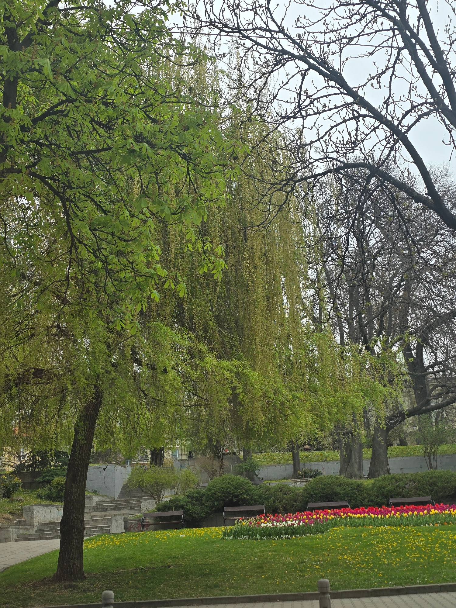 The image shows a park scene in Sofia, Bulgaria. The view is dominated by trees: a tree with fresh green leaves in the lower left, a willow tree with cascading green branches, and trees with bare bran…read more