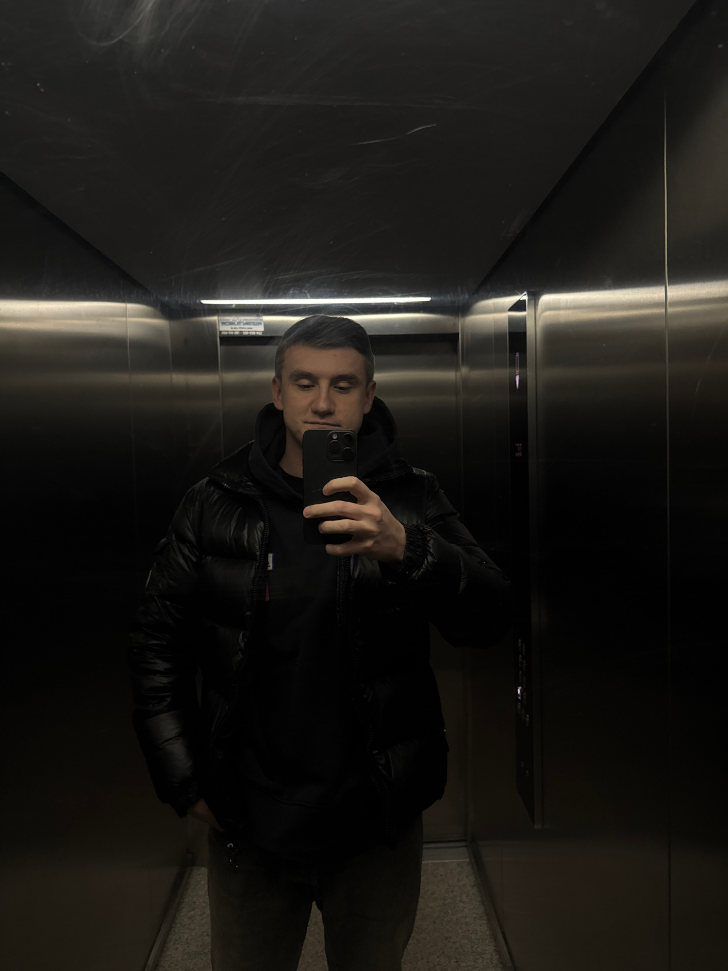 A man stands in an elevator, holding a phone in his right hand to take a selfie. He is wearing a black hooded sweatshirt under a black puffer jacket. The elevator has stainless steel walls and a grayβ¦read more