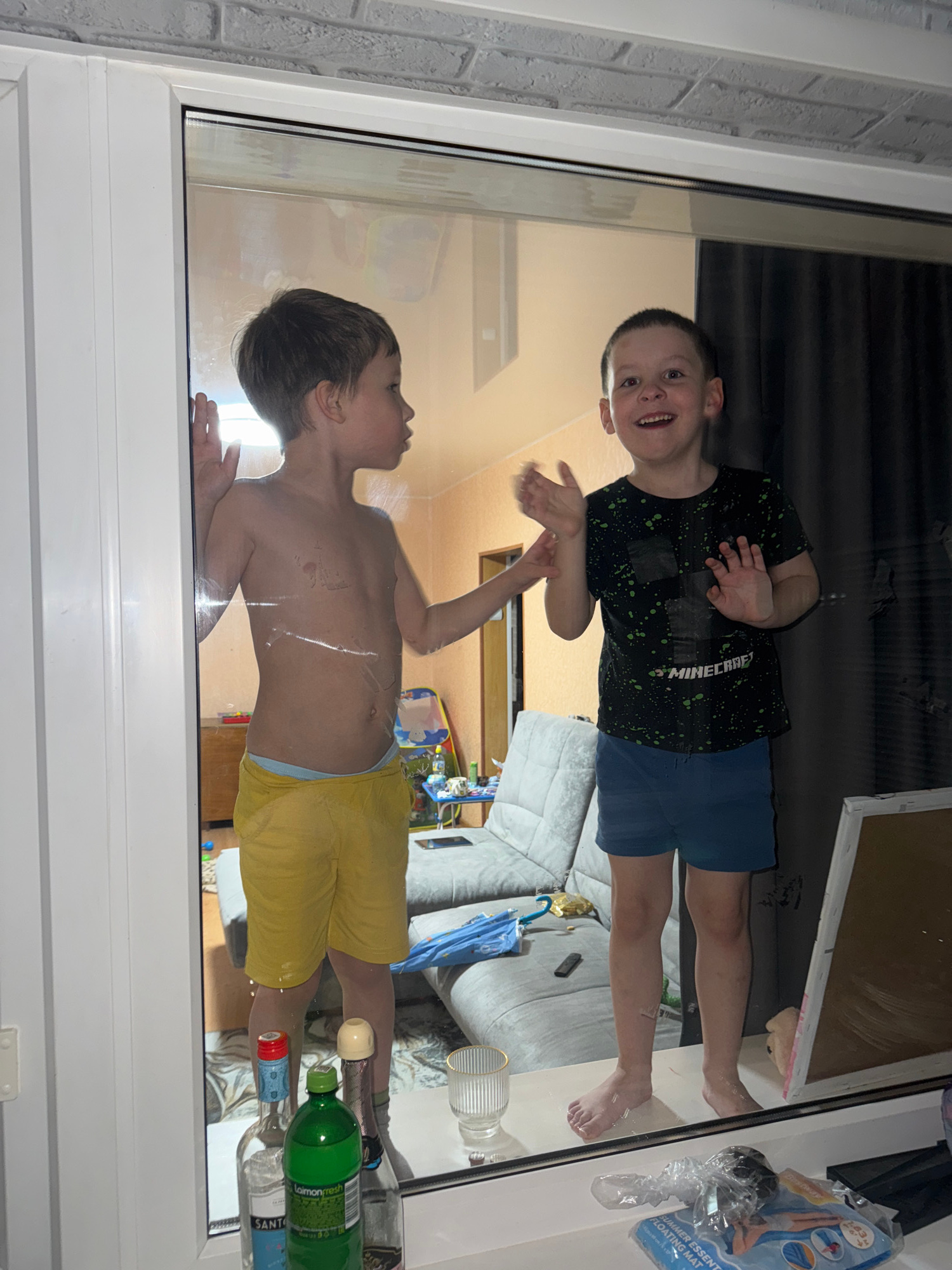 A photograph shows two children reflected in a window. One child is wearing a dark t-shirt with "Minecraft" written on it and blue shorts. The other child is wearing yellow shorts and is shirtless. Th…read more