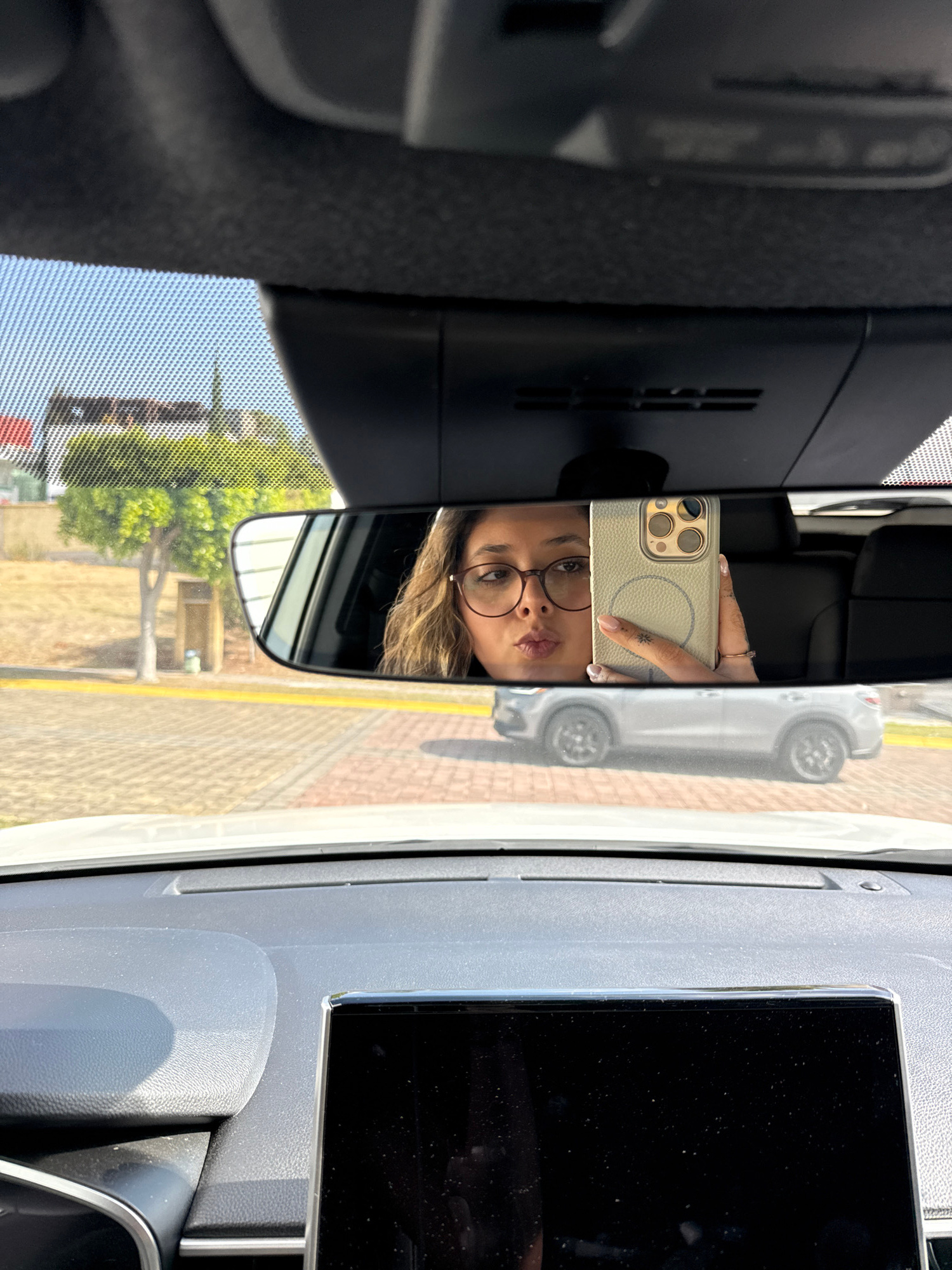 A selfie is reflected in a rearview mirror inside a vehicle, presumably a car. The selfie shows a person with brown hair, glasses, and a phone with a tan case, making a kissing face. The rearview mirr…read more