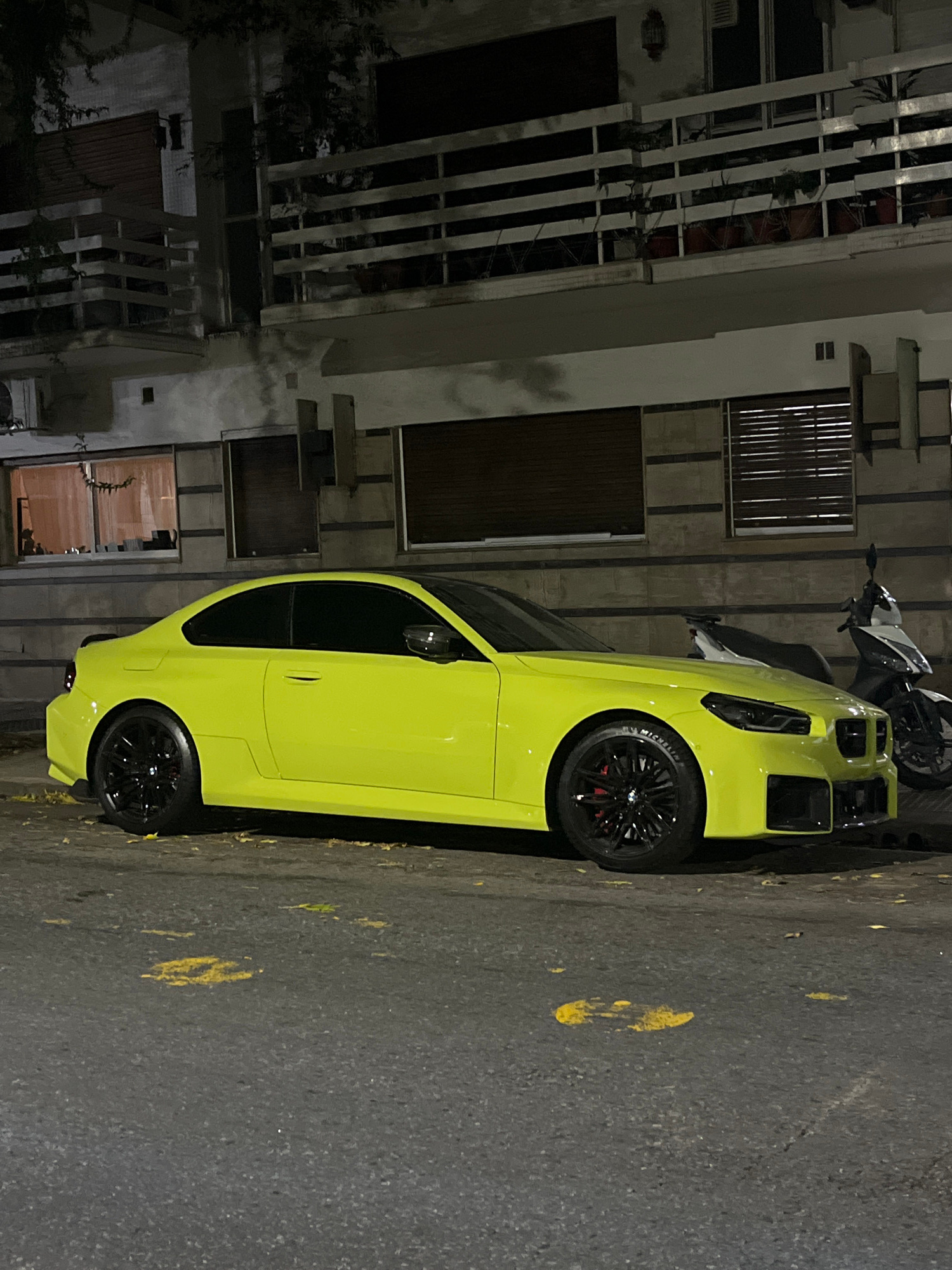 The image displays a vibrant, neon yellow-green sports car, identifiable as a Chevrolet Corvette C8, parked on an asphalt road. The car features black multi-spoke wheels, with visible red brake calipe…read more