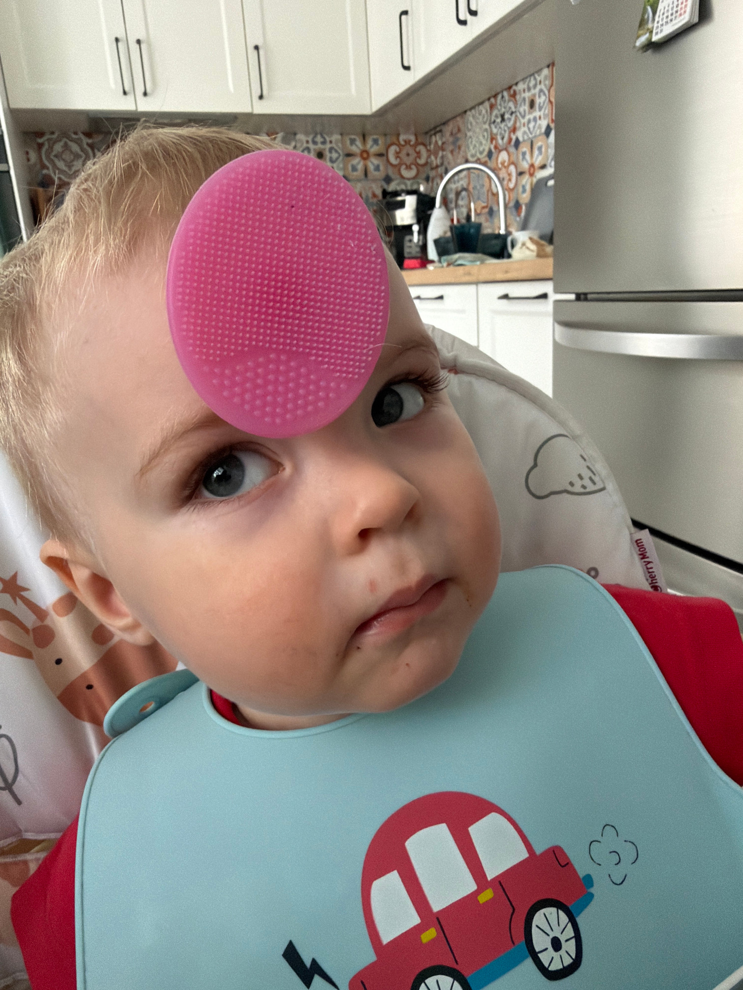 A baby wearing a light blue bib with a red car design is lying down. A pink, circular object covers a portion of the baby's forehead. The location is not discernible from the image, and therefore I ca…read more