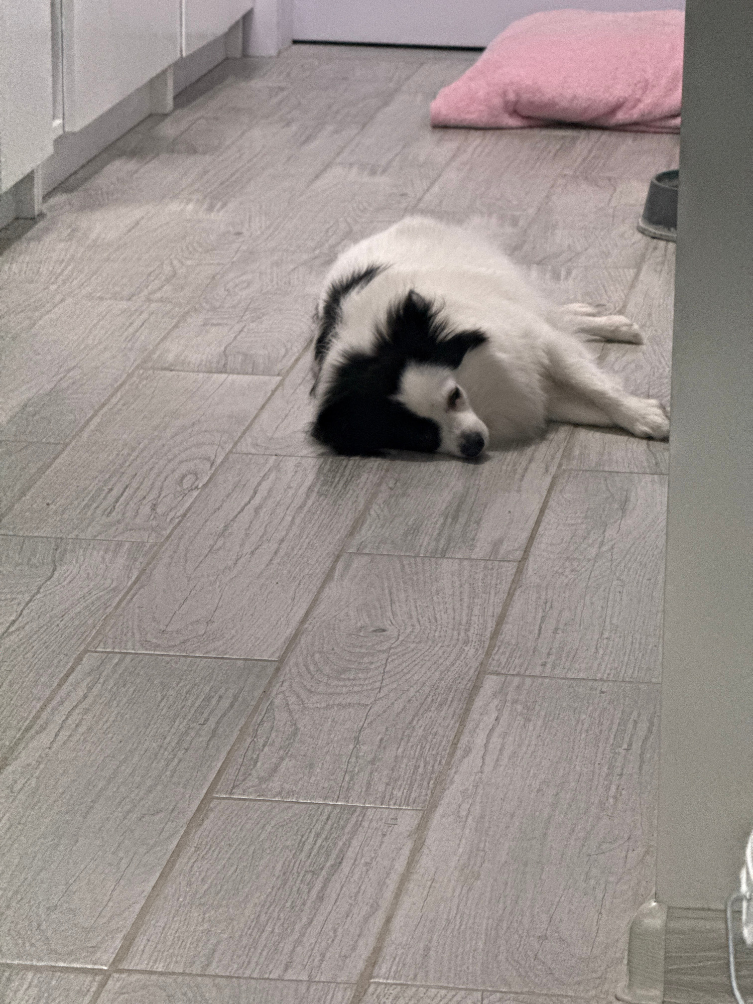 A medium shot angled vertically shows a black and white dog lying on a light gray wood-look tiled floor. A pink pillow is to the left of the dog. A gray countertop overhangs the scene at the top. A wh…read more