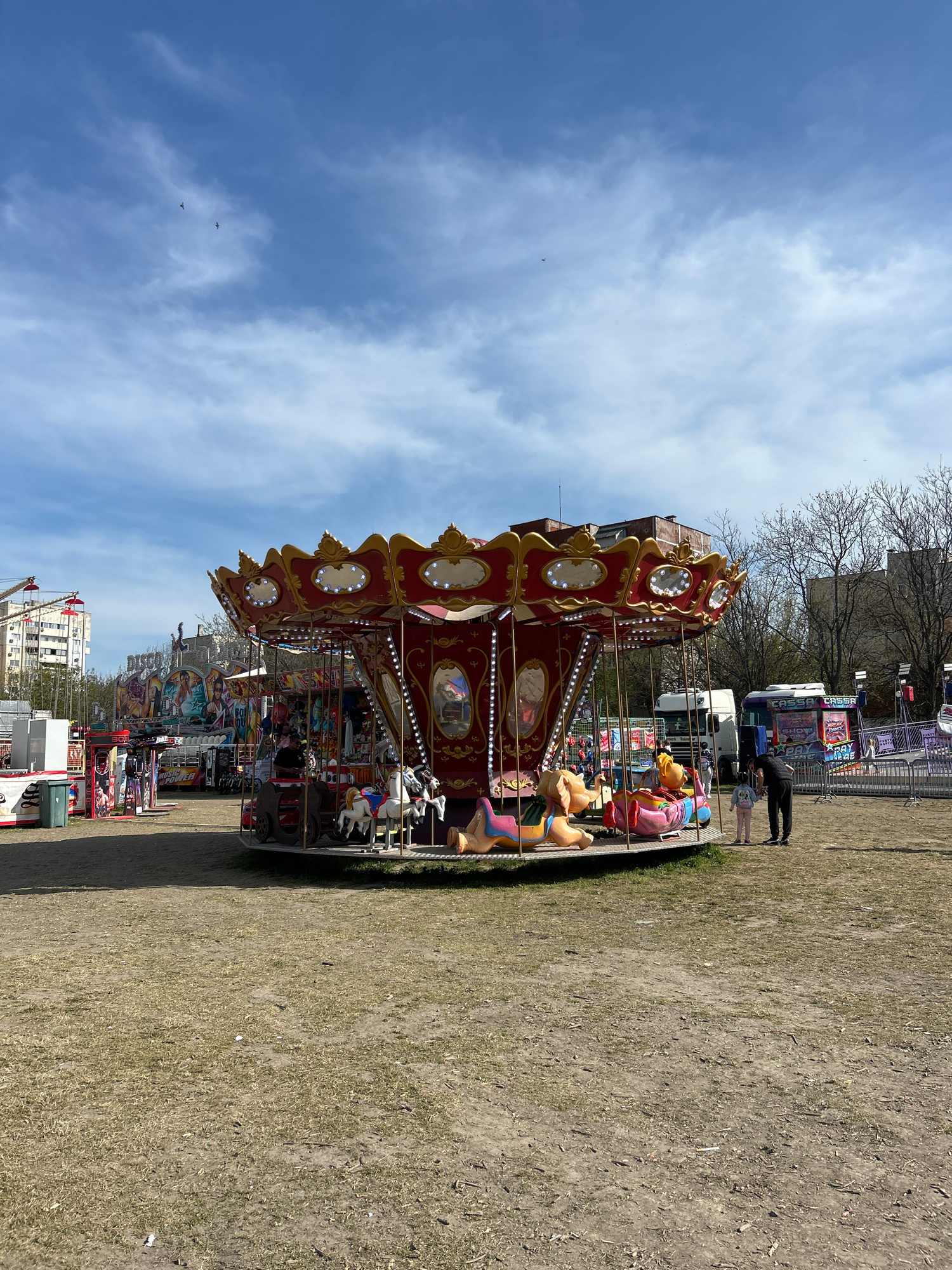 The image captures a vibrant scene at an outdoor fairground, featuring a large, ornate carousel as the central subject. The carousel is predominantly red and gold, adorned with intricate patterns andβ¦read more