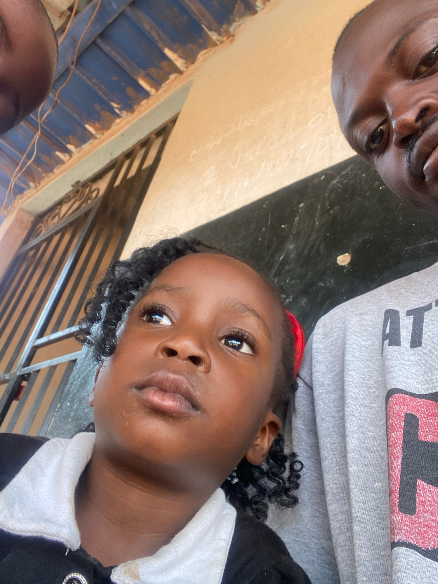 The image shows two people in an indoor setting. A young girl with dark skin and curly black hair styled with a red hair accessory is in the foreground wearing a black and white collared outfit. Behinβ¦read more