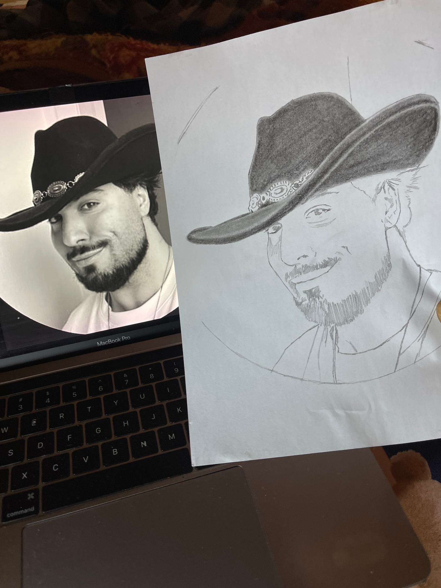 Here is a description of the image. A photograph depicts a hand-drawn pencil sketch of a man wearing a cowboy hat. The sketch is on a piece of white paper that is resting on a laptop. The laptop scre…read more