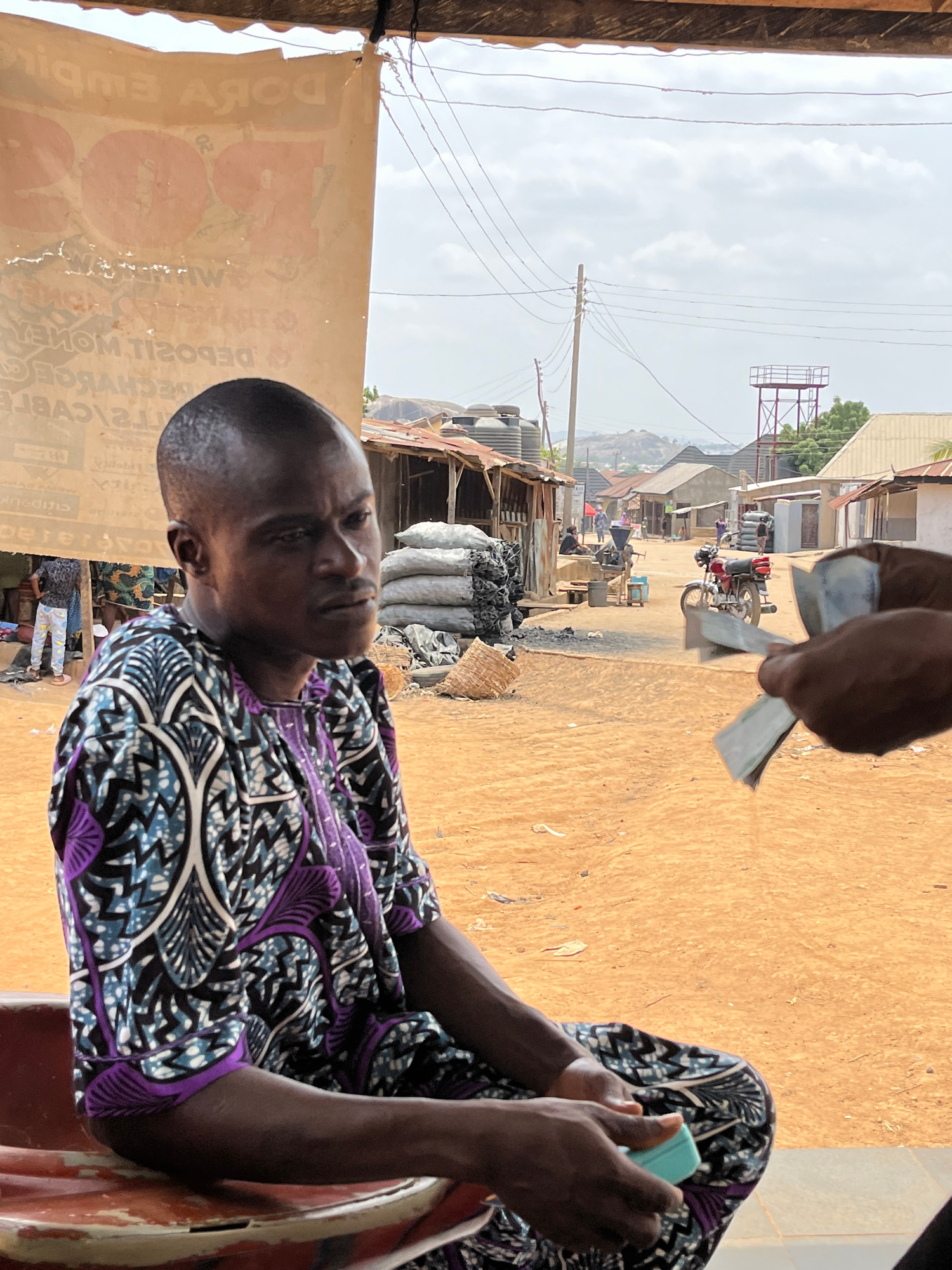 A man in a patterned purple and black shirt sits holding a small blue object, possibly a phone, in a crowded street in Kwamba, Nigeria. A hand above him holds out money, presumably for a transaction.…read more