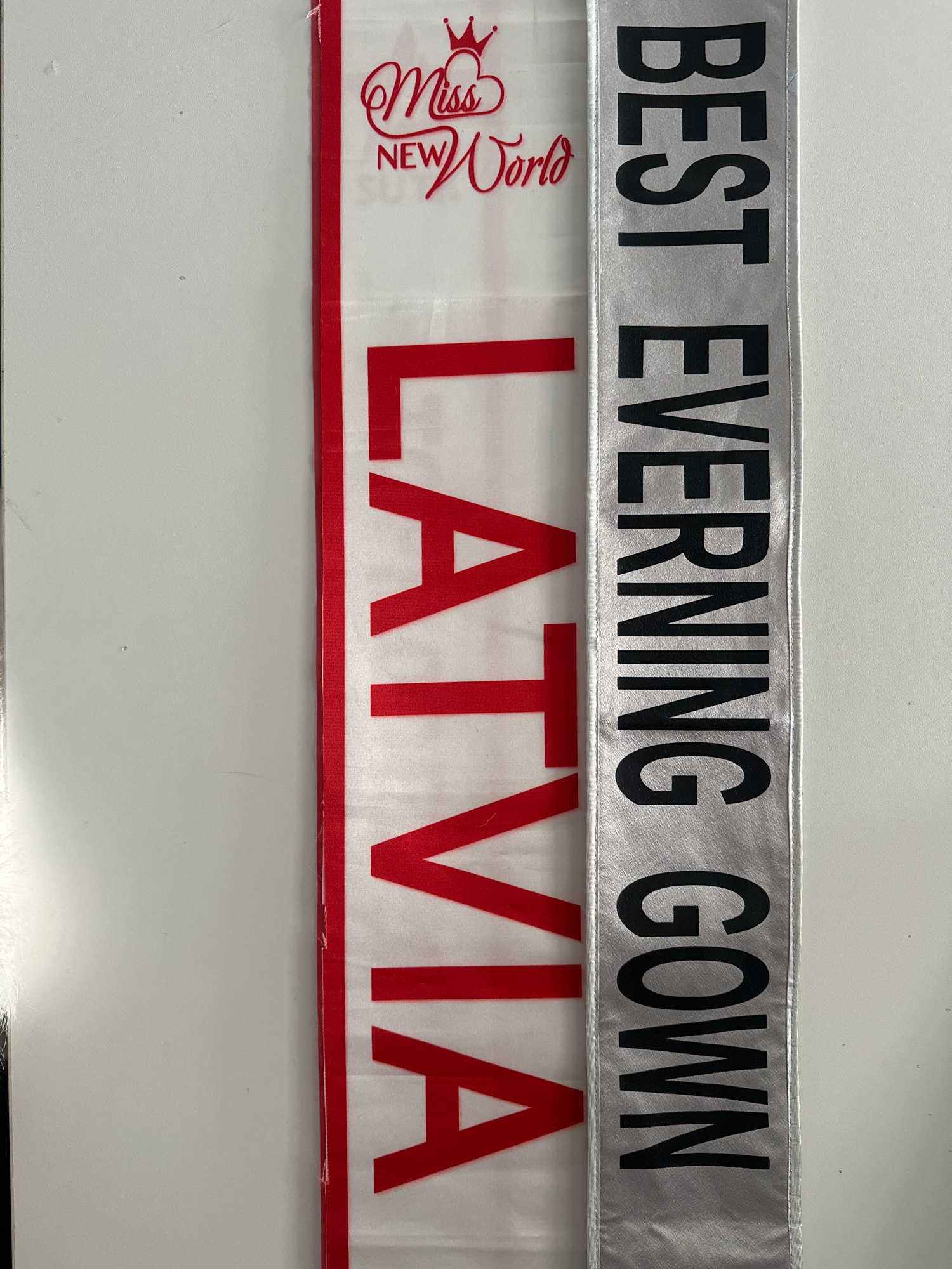 The image shows two pageant sashes. The top sash is silver with the words "BEST EVENING GOWN" printed in black. The bottom sash is white with a red stripe along the bottom edge and the words "Miss New…read more