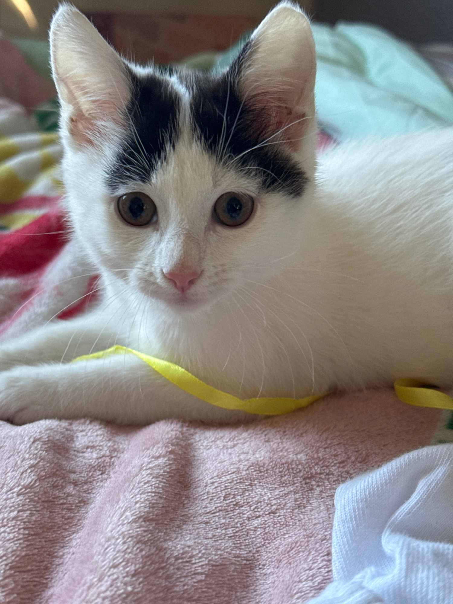 A close-up shot features a white kitten with black markings on its head, specifically near its ear and on the top of its head. The kitten has brown eyes and a pink nose. It is wearing a yellow ribbon…read more