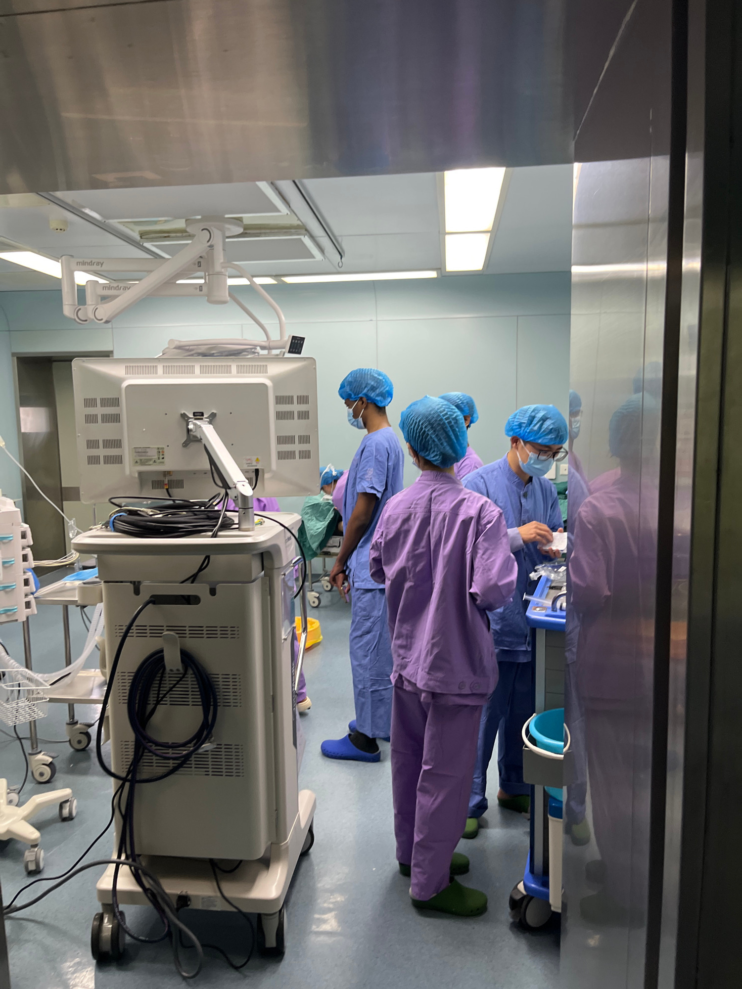 The image shows a surgical operating room. Three individuals wearing surgical scrubs, surgical caps, and face masks are present. One individual is wearing purple scrubs, while the other two are wearin…read more