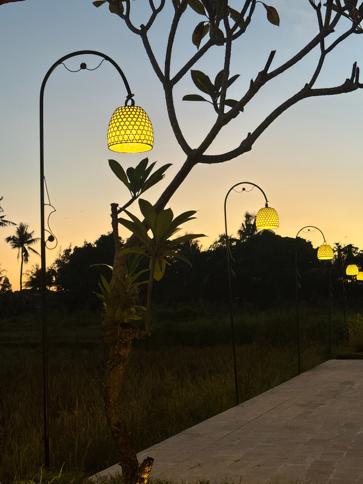 The image depicts a serene outdoor scene at dusk or early evening, characterized by a gradient sky transitioning from light blue on the left to a warm golden-orange hue on the right. The artificial il…read more