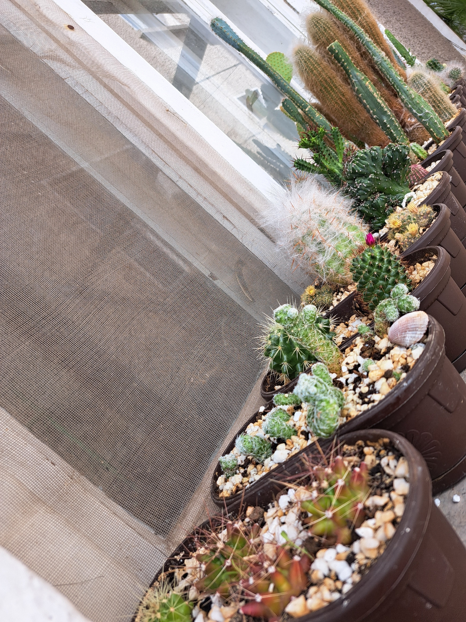 The image shows a row of potted cacti arranged along the ledge of a window. The cacti vary in type, some long and cylindrical, others rounded with fine spines. The pots are brown and filled with light…read more