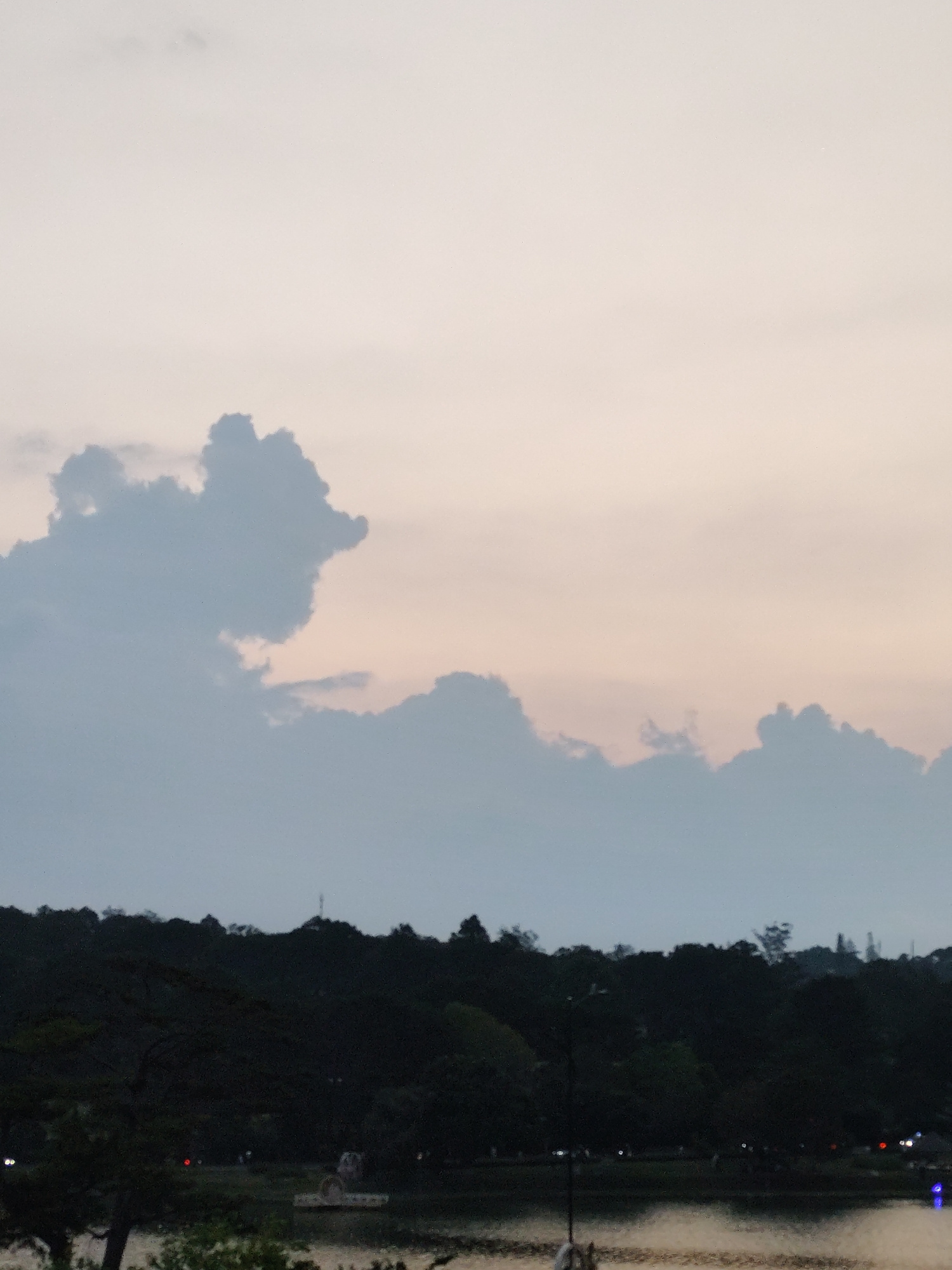 The image captures a landscape view in Da Lat, Vietnam. A lake occupies the lower portion, its surface reflecting the ambient light. The foreground shows partial views of trees and vegetation, obscuri…read more