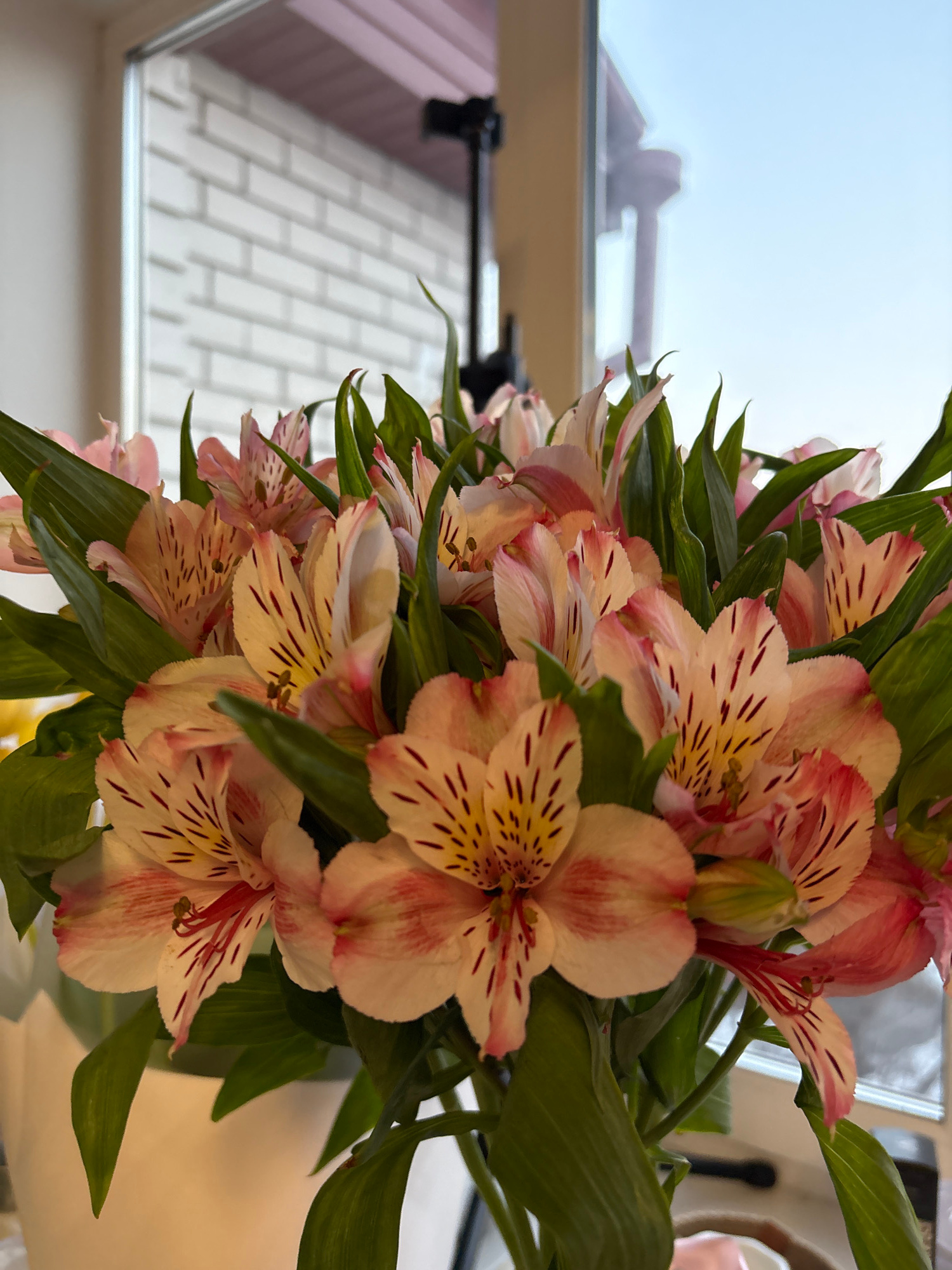 A close-up shot features a bouquet of light pink and white Alstroemeria flowers with delicate red stripes on their petals and lush green leaves. The background reveals a partial view of a window overlβ¦read more