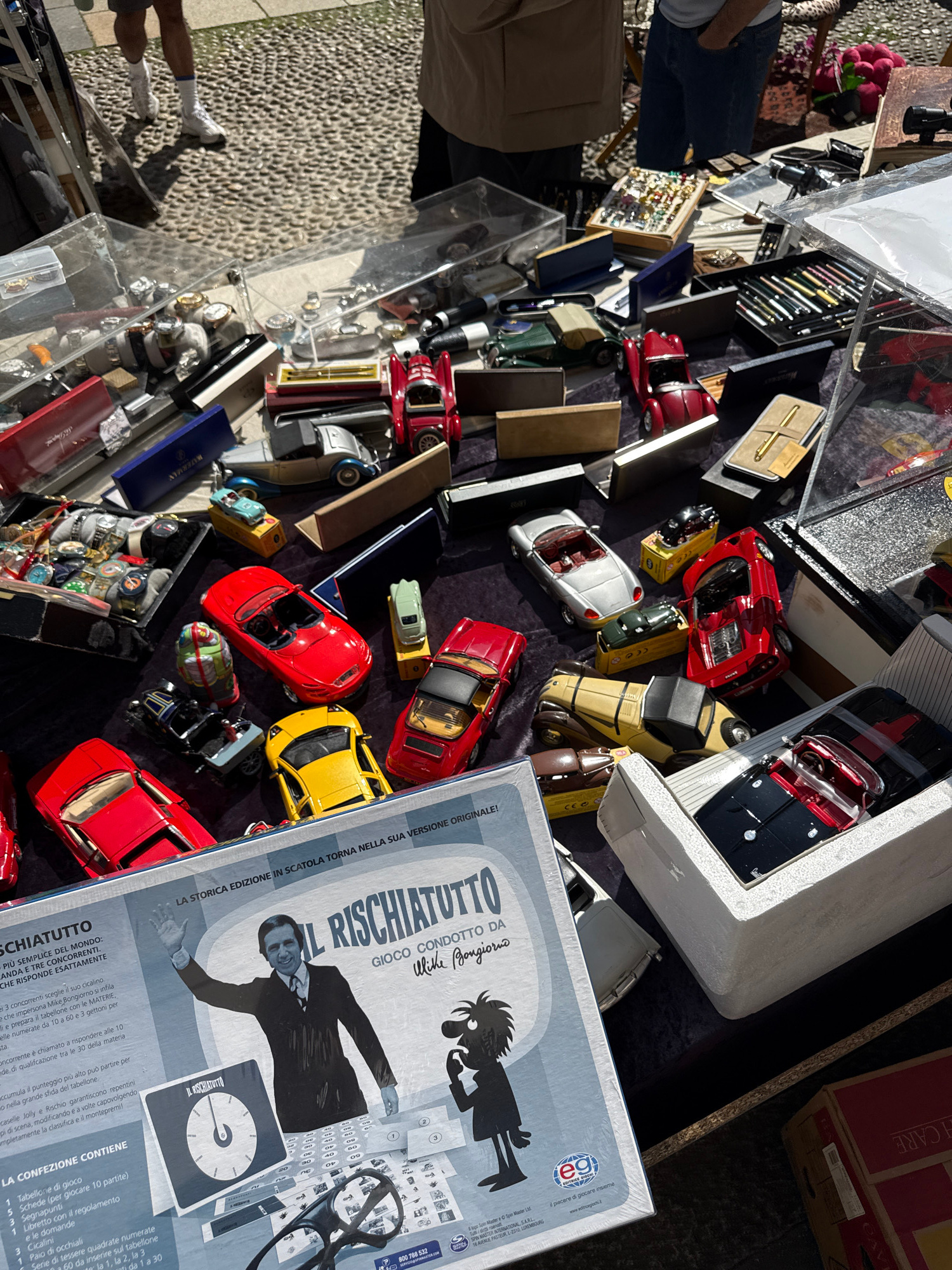 The image shows a table at an outdoor market. On the table are a variety of items, including model cars, pens in boxes, and a boxed board game called "Il Rischiatutto." People are browsing the items o…read more