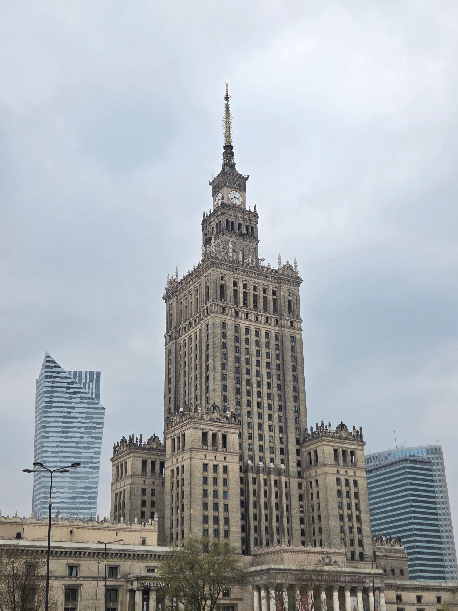 The image depicts the Palace of Culture and Science in Warsaw, Poland, surrounded by modern skyscrapers. The Palace is a tall, ornate Stalinist-era building with a prominent clock tower and spire. It…read more