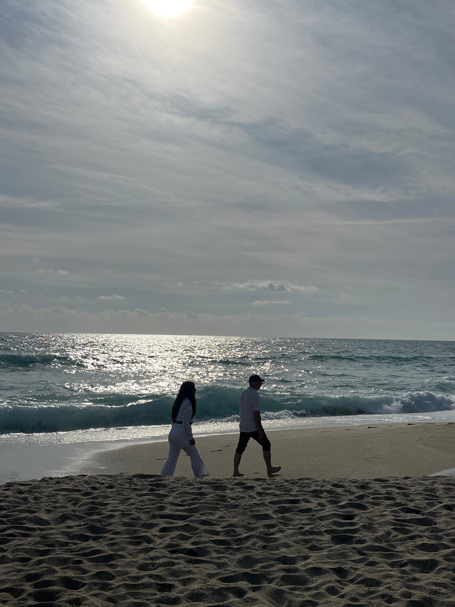 The scene depicts a sandy beach in Alanya, Turkey. The sky is largely overcast with scattered clouds, and the sun, positioned in the upper right quadrant, casts a bright glare. Two individuals are obs…read more