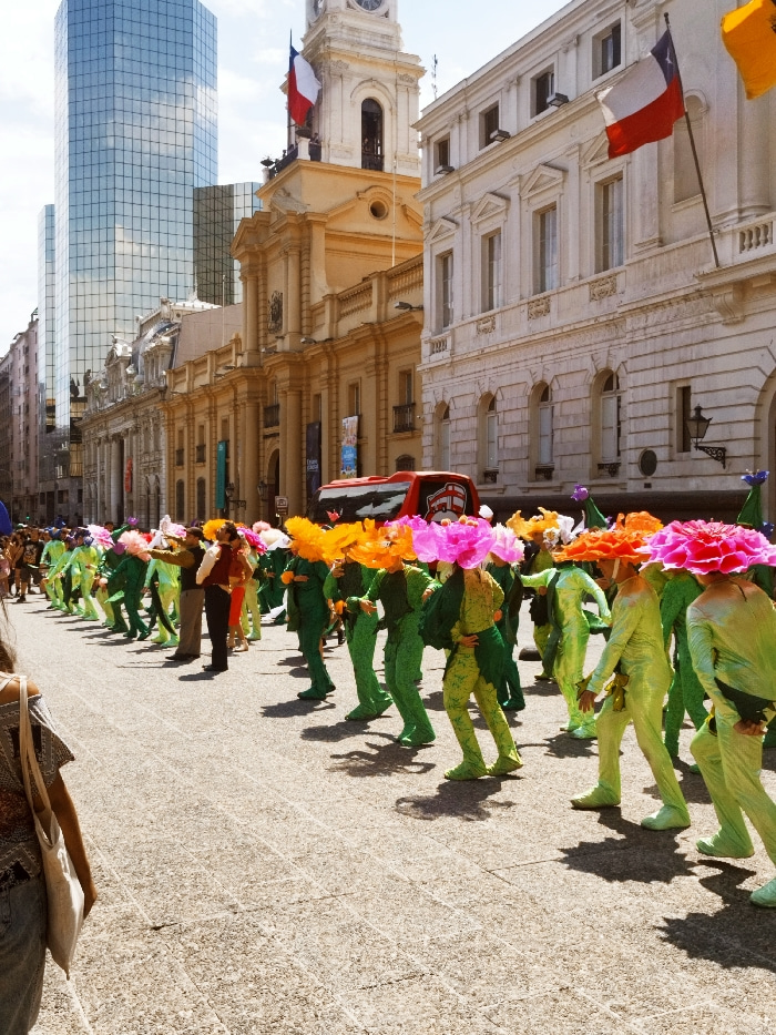 This vibrant daytime image captures a street parade or performance taking place on a sunny day. In the foreground, the back of a person is partially visible on the left, wearing a light-colored, patte…read more