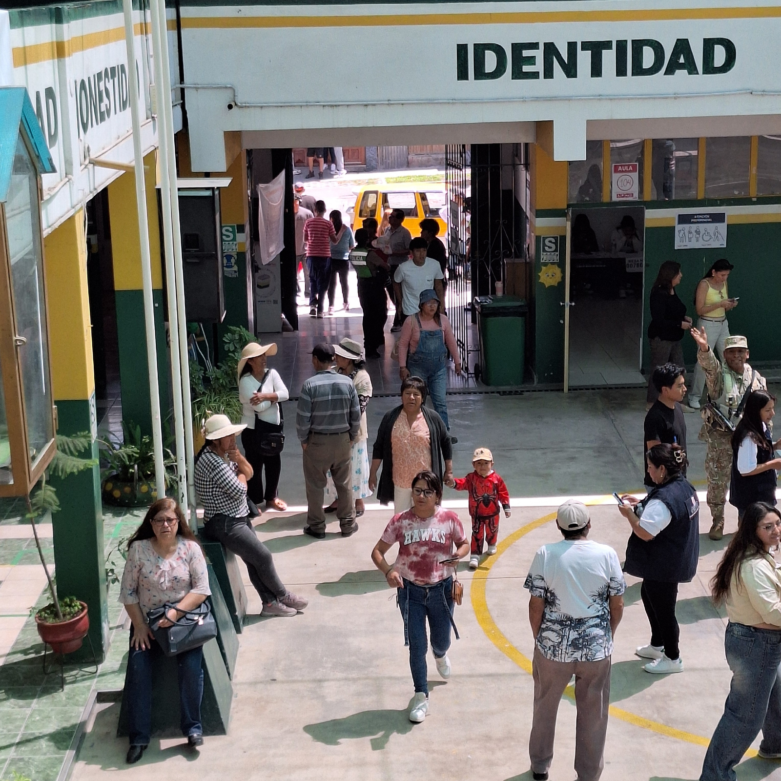 The image shows a group of people waiting in line outside a building in Mariano Melgar, Peru, likely a government office or service center, given the sign "IDENTIDAD" (Identity). The line is on a concβ¦read more
