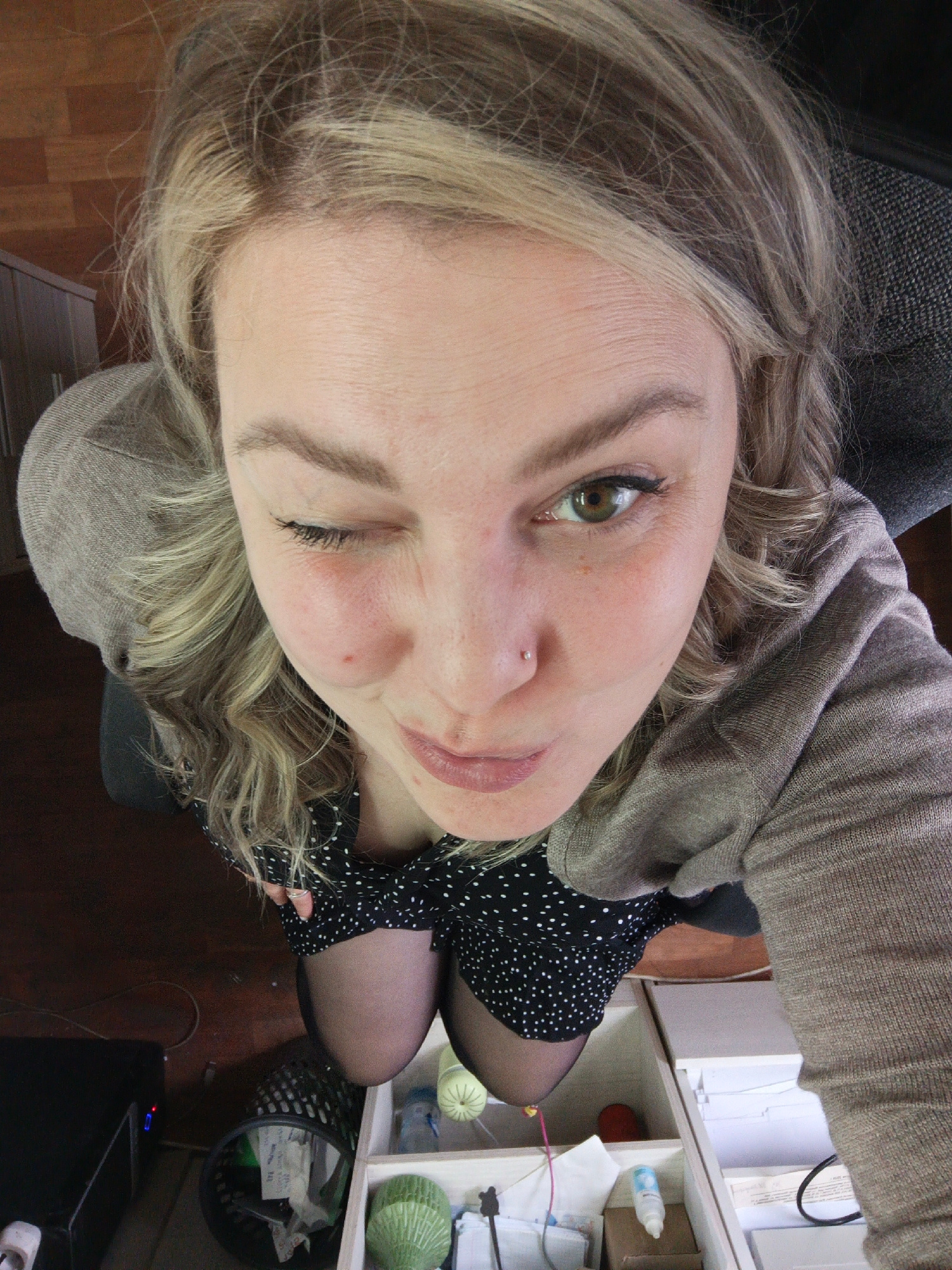 A woman with blonde hair is looking upwards at the camera with a wink. She has a nose piercing, a mole on her left cheek, and is wearing a black dress with white polka dots and a light brown cardigan.…read more