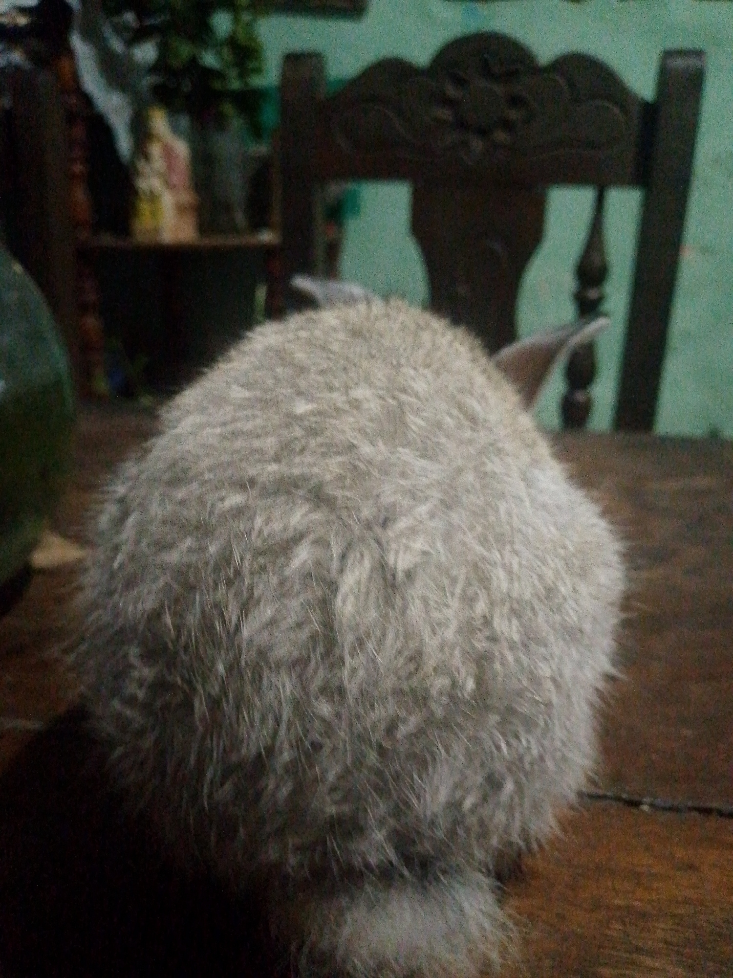 A blurry image depicts a rabbit on a dark wooden table indoors. The rear of the animal is in view, showing its light gray fur and a small portion of the ears. Behind the rabbit, a carved wooden chair…read more