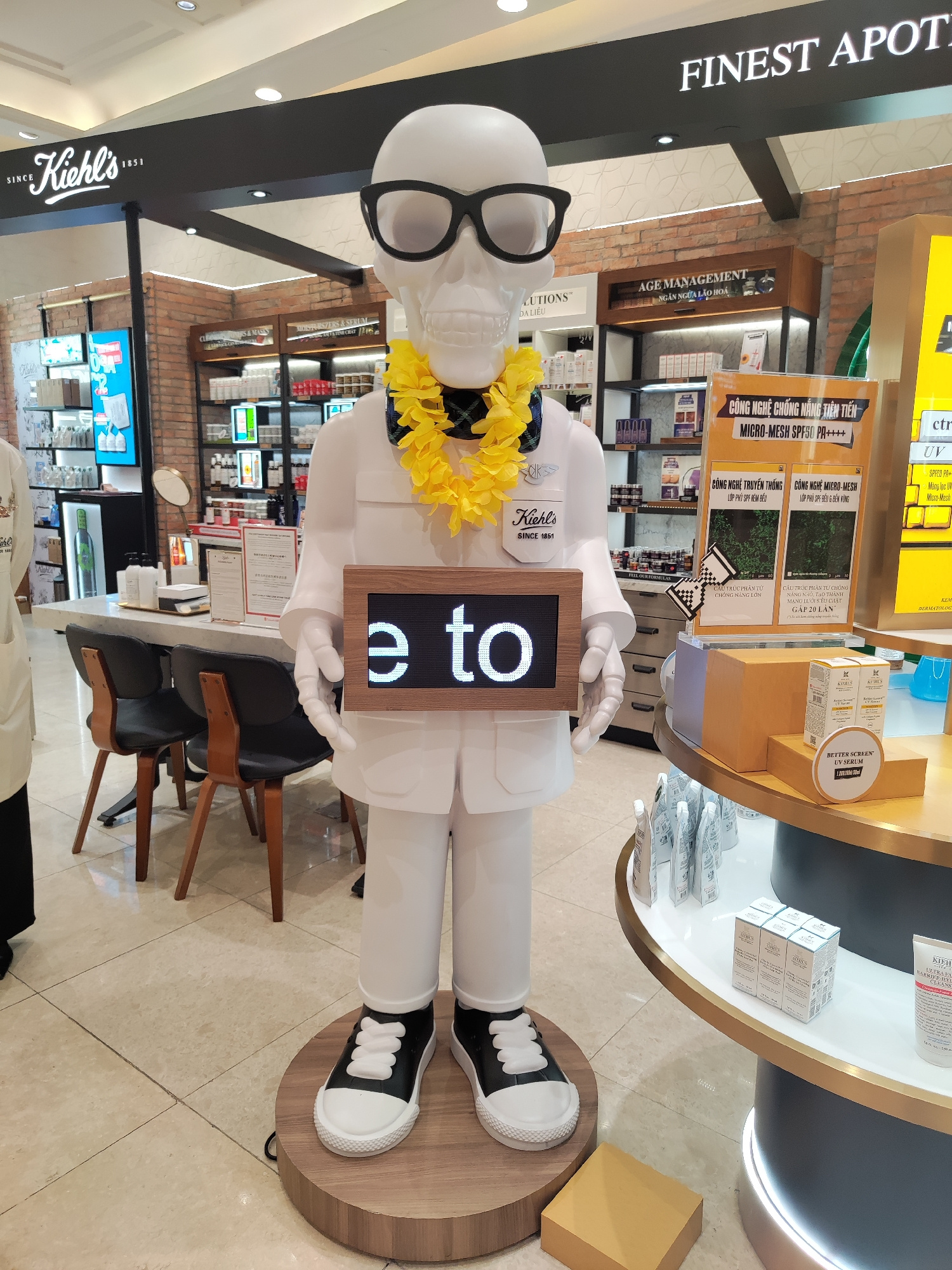 The image captures the interior of a Kiehl's store, likely located within a shopping center or department store. Dominating the foreground is a white mannequin figure resembling a skeleton wearing gla…read more