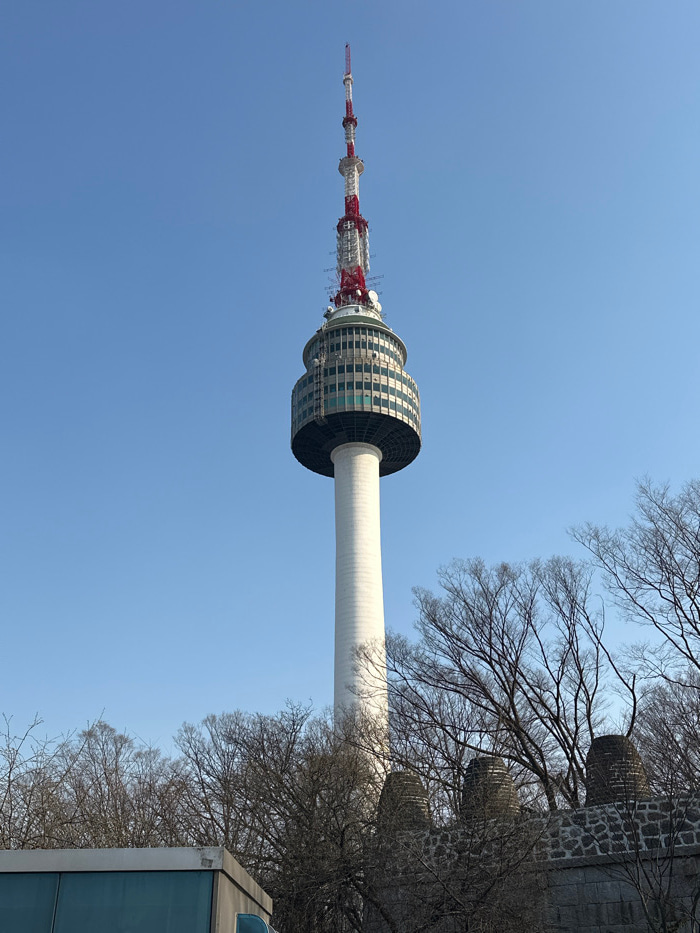 The image displays a vertical composition of the N Seoul Tower, commonly known as Namsan Tower, situated on Namsan Mountain in Seoul, South Korea. The central object is the tower itself, comprising a…read more