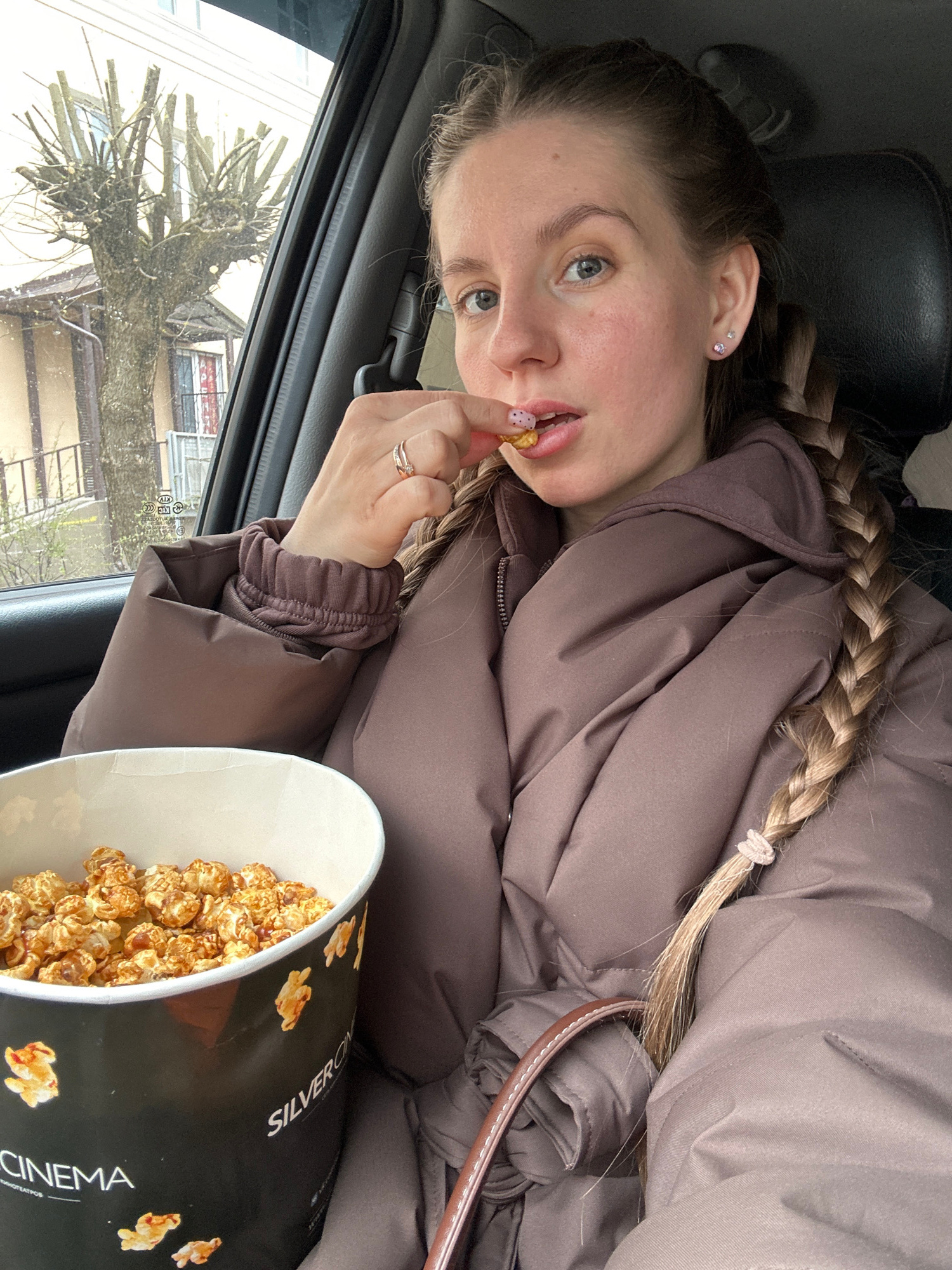 A young woman with fair skin, light eyes, and a blonde braid is eating caramel popcorn in a car. She's wearing a brown puffy jacket. A large black bucket labeled "CINEMA" and "SILVERCINEMA" is partial…read more