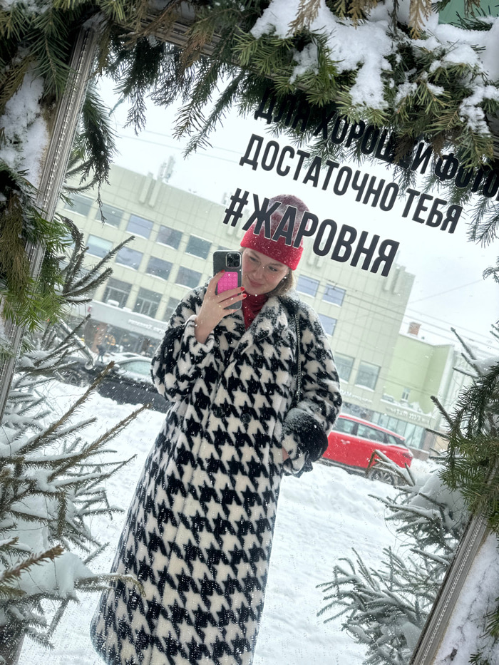 A female individual is depicted taking a mirror selfie in an urban, snowy environment in Kazan, Russia. She is wearing a red knit beanie, glasses, a red turtleneck, and a black and white houndstooth p…read more