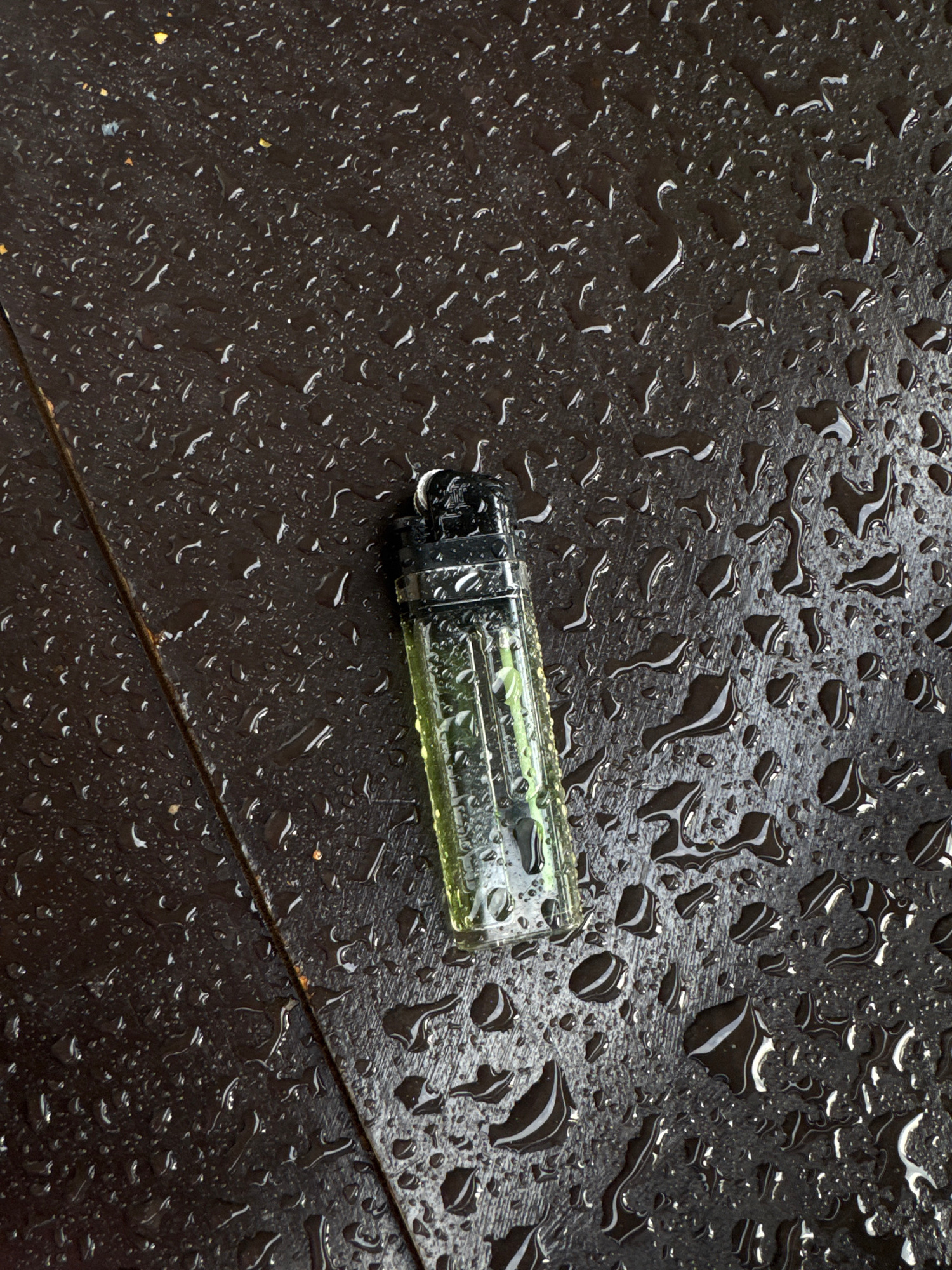 The image shows a lighter resting on a wet wooden surface. The lighter is clear with green liquid inside. The surface is dark brown and covered in water droplets. The droplets vary in size and shape,…read more