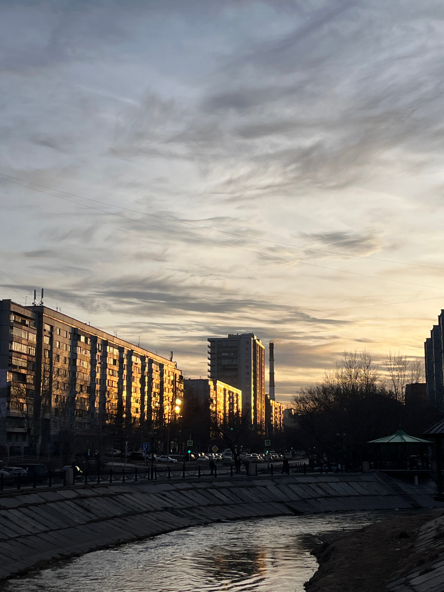 The image depicts a cityscape at dusk. The sky is overcast with striated clouds, reflecting a pale yellow light near the horizon. Multiple buildings, possibly apartment blocks, line a waterway, with t…read more