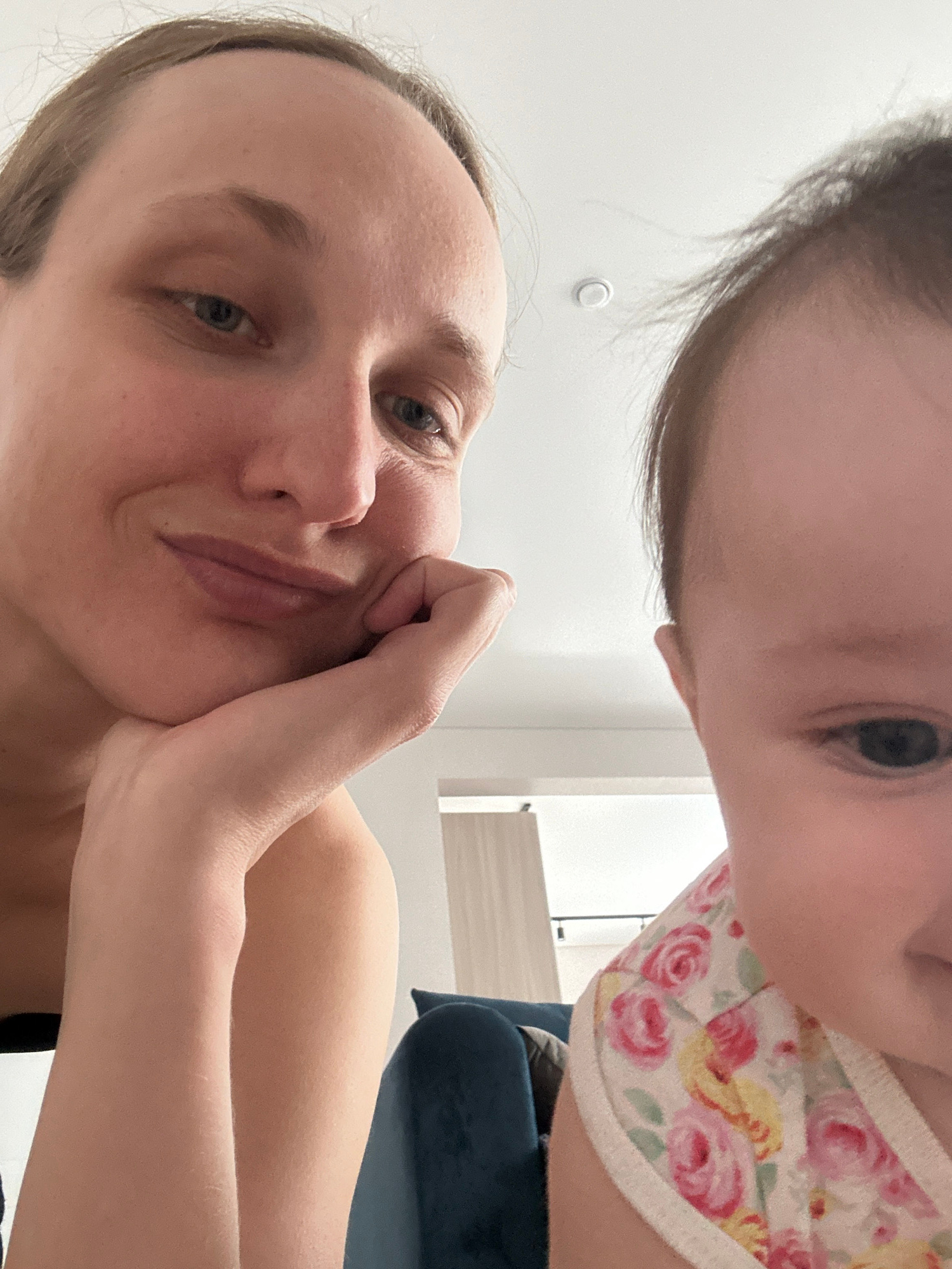 The image captures a close-up perspective of a woman and a young child, possibly in an indoor setting. The woman is looking at the camera with a hand resting on her face. The child is close to the cam…read more