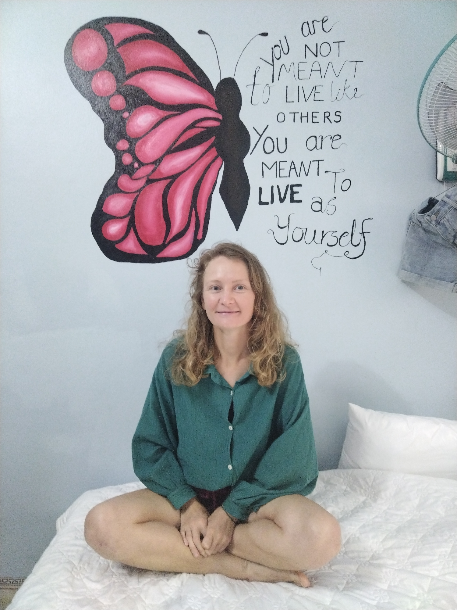 A woman with light, wavy blonde hair, wearing a loose-fitting dark green long-sleeved shirt and dark shorts, sits cross-legged on a white quilted bed. She is looking directly at the camera with a calm…read more