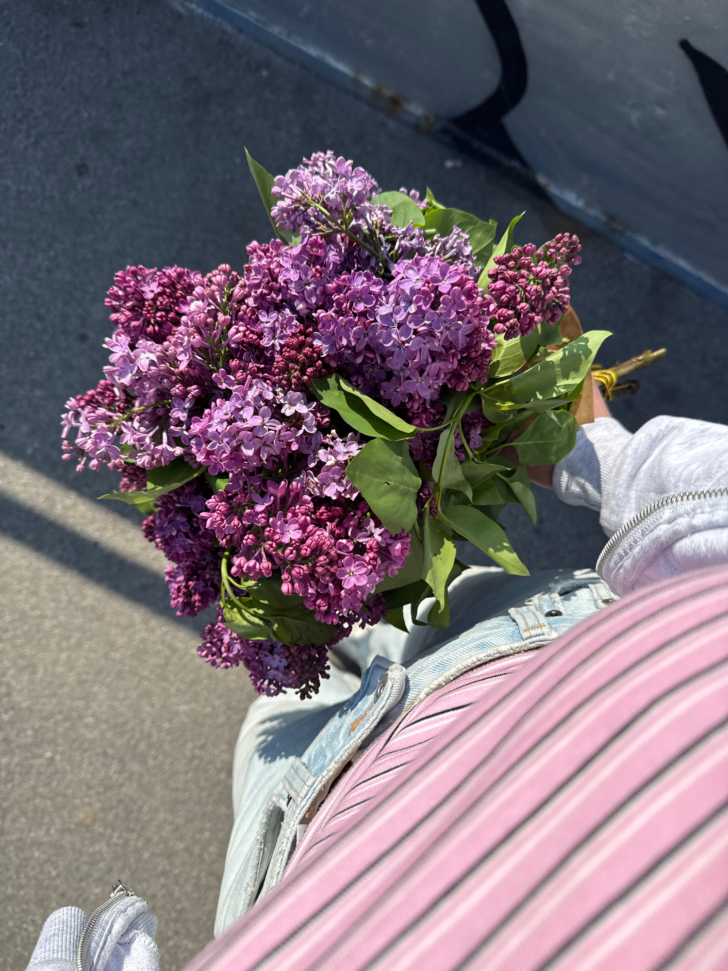 The image presents a top-down view of a person holding a voluminous bouquet of vibrant purple lilac flowers. The blossoms exhibit various shades of lavender and deeper violet, interspersed with fresh…read more