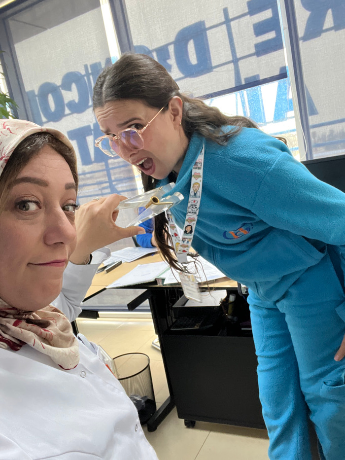 Two women pose for a selfie, oriented sideways. One woman wears a white lab coat with a patterned headscarf. The other, slightly behind, wears a blue tracksuit and a lanyard with cartoon characters. B…read more