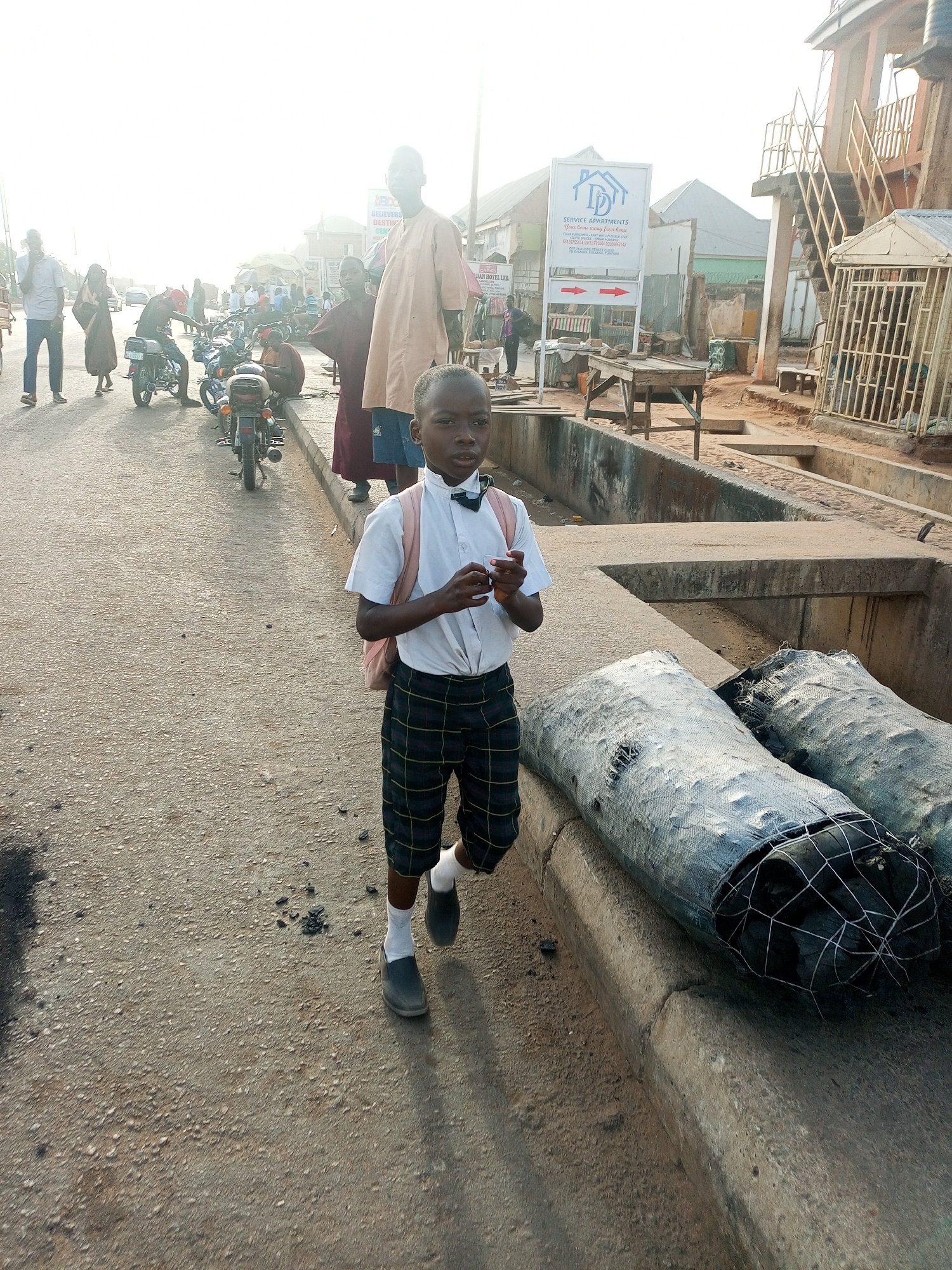 A young child in school uniform walks on a city street in Timia, Niger. The child wears a white short-sleeved shirt, plaid knee-length pants, white socks, and dark shoes, along with a backpack and bow…read more