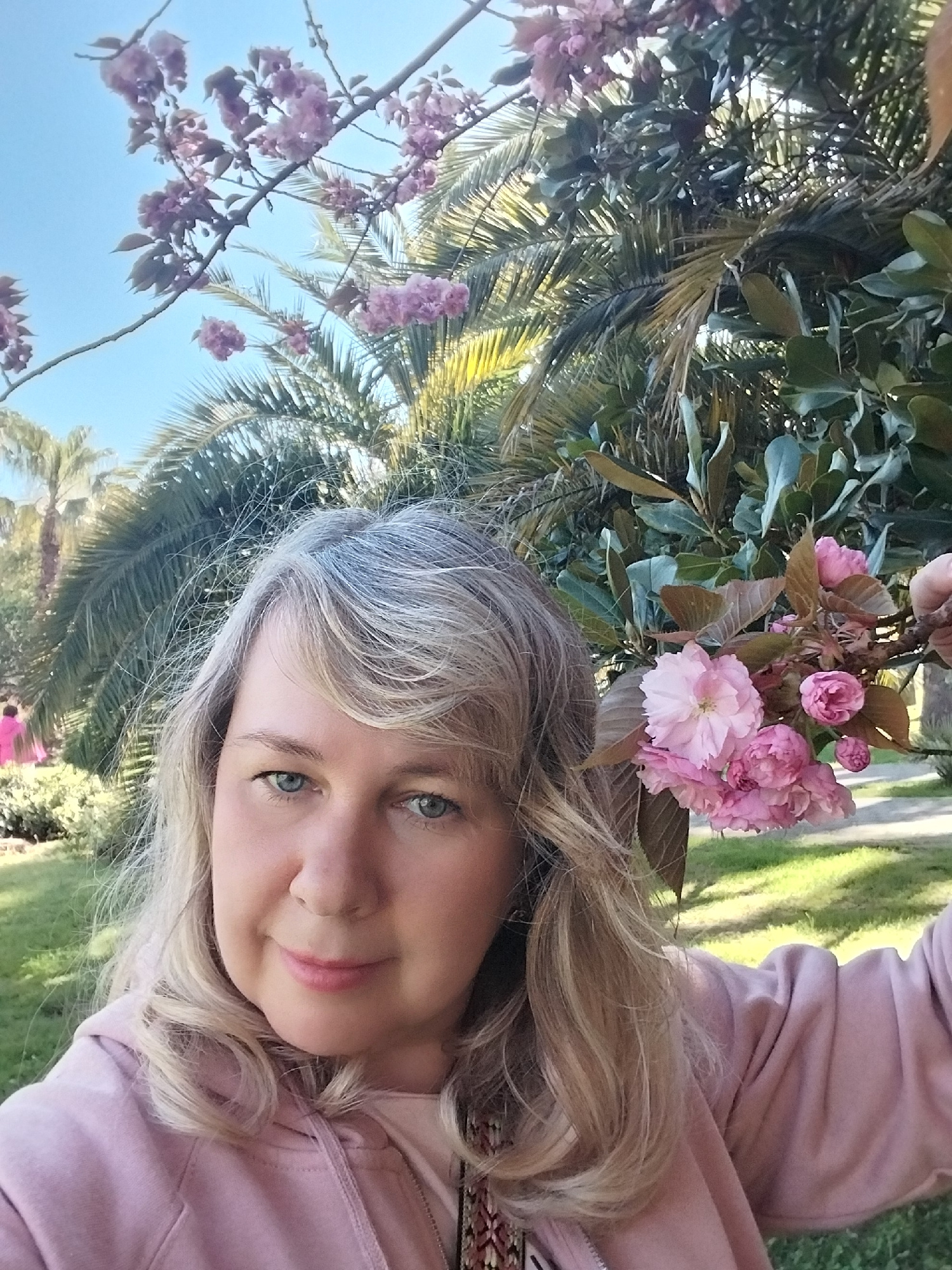 A woman captures a vertically oriented selfie outdoors in what appears to be Sochi, Russia. She has long, wavy blonde hair with some lighter highlights, and striking blue-green eyes. Her expression is…read more